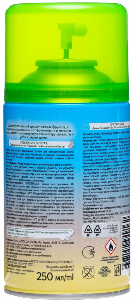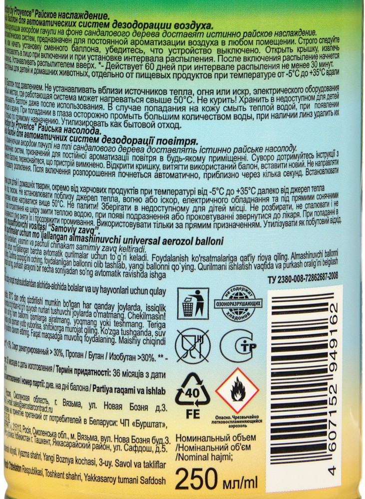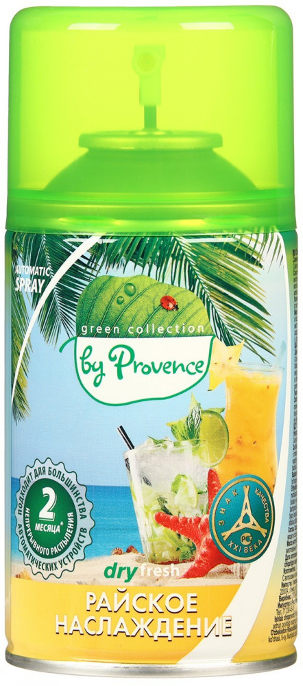 Универсальный сменный аэрозольный баллон от «by Provence» с формулой «сухое распыление» создан специально для автоматических систем дезодорации воздуха. «Сухое распыление» позволяет сохранить аромат на длительное время, не оставляет следов на кафельной плитке, потолке, обоях и гардинах. Обладает ярко выраженным действием против запаха табачного дыма. Экзотический аромат восстановит душевную гармонию и создаст атмосферу спокойствия и безмятежности в Вашем доме.
