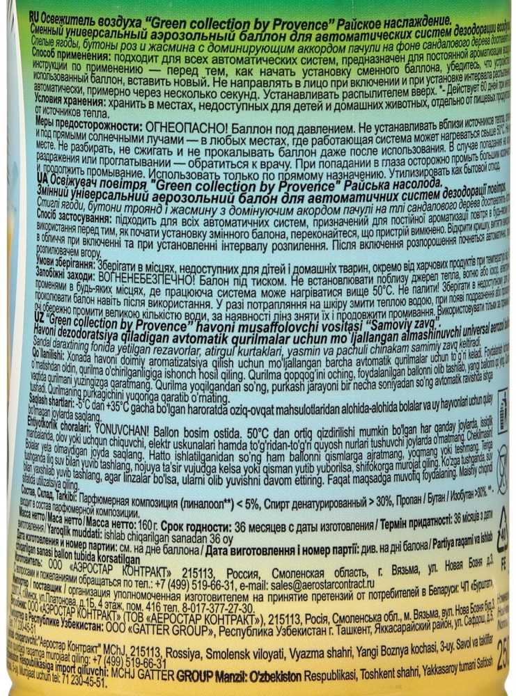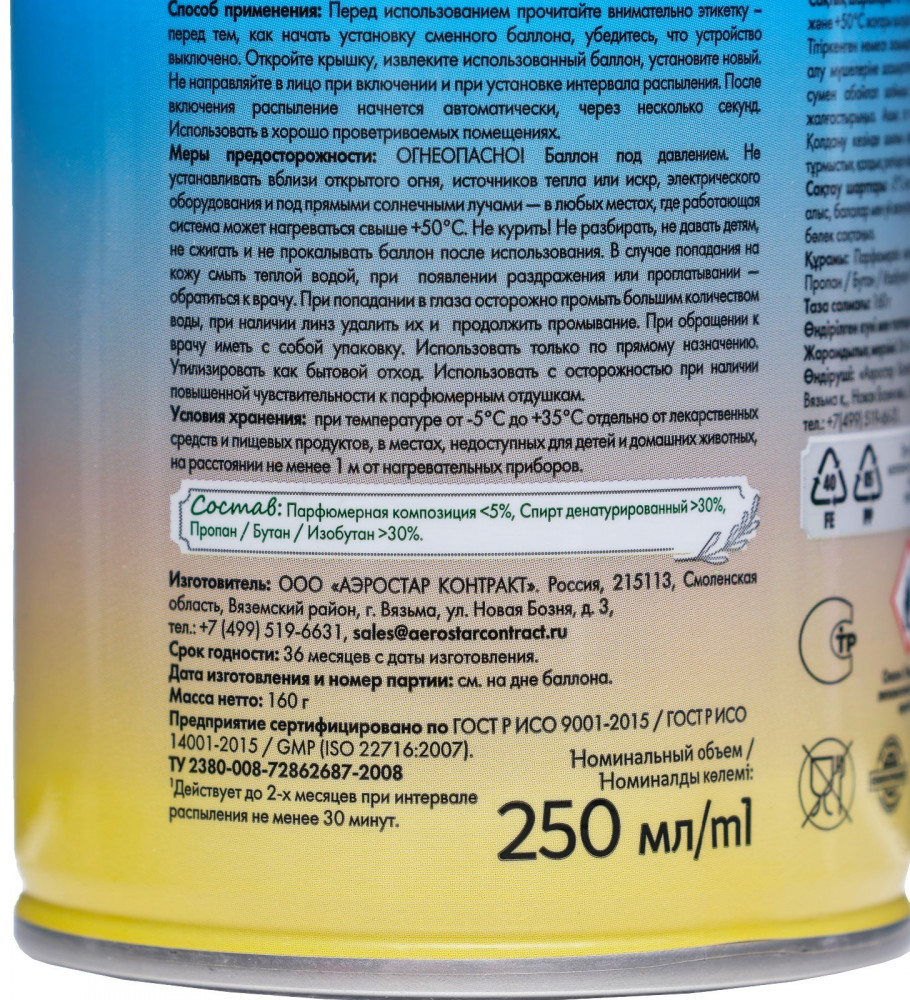 Способ применения: подходит для всех автоматических систем, предназначен для постоянной ароматизации воздуха в любом помещении. Строго следуйте инструкции по применению — перед тем, как начать установку сменного баллона, убедитесь, что устройство выключено. Откройте крышку прибора, извлеките использованный баллон, вставьте новый. Не направляйте в лицо при включении и при установке интервала распыления. После включения распыление начнется автоматически, примерно через несколько секунд. Устанавливать распылителем вверх.