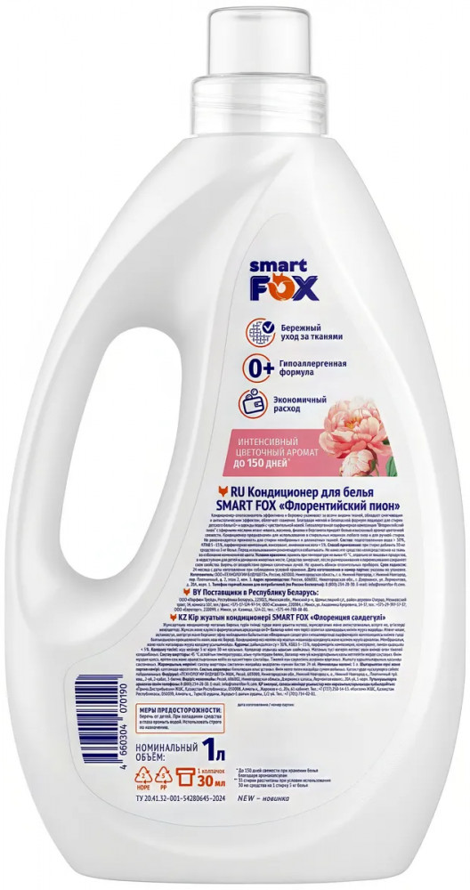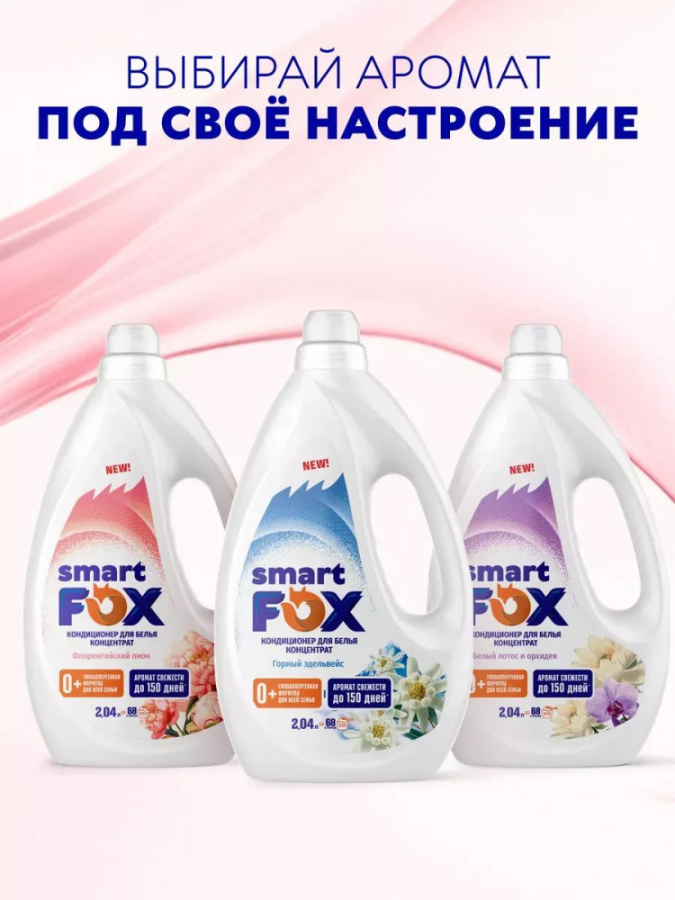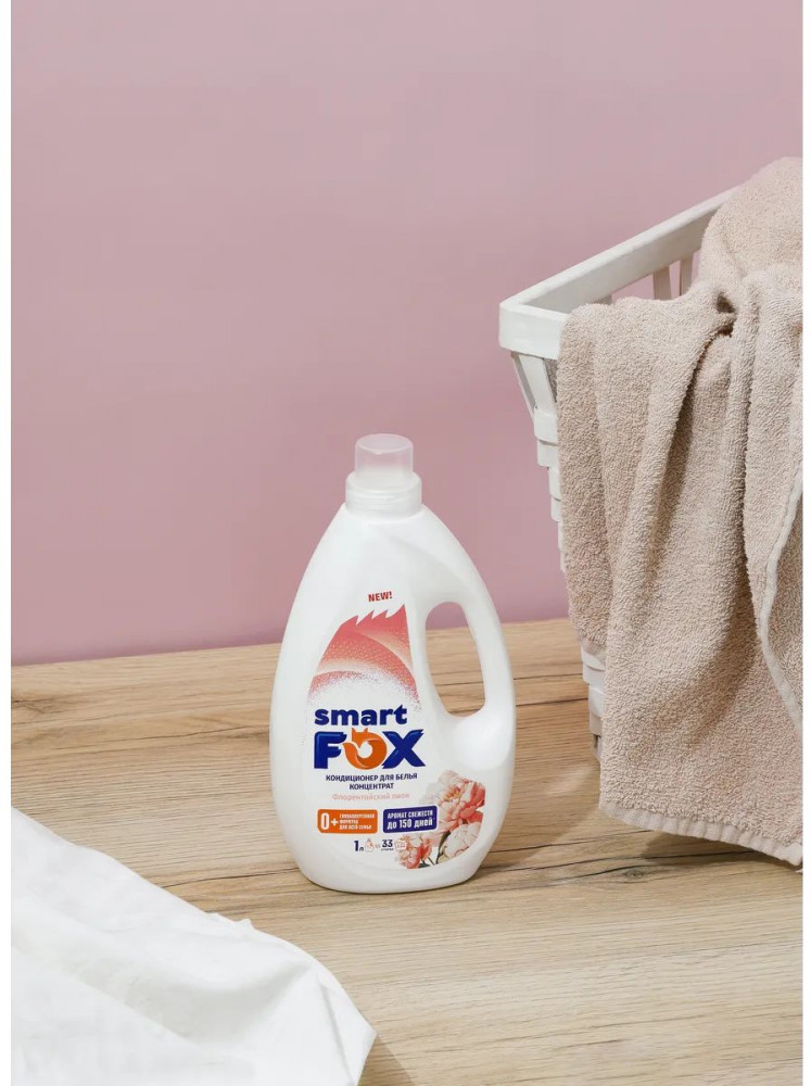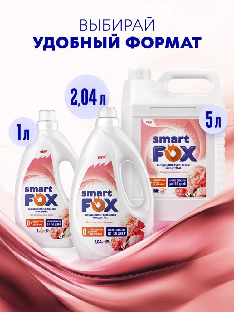 Кондиционер для белья Smart Fox эффективно и бережно ухаживает за всеми видами ткани, обладает смягчающим и антистатическим эффектом, облегчает глажку. Благодаря аромакапсулам свежесть при хранении белья сохраняется до 150 дней. Гипоаллергенная парфюмерная композиция Флорентийский пион с эфирными маслами иланг-иланга, жасмина, фиалки и бергамота придаёт белью изысканный аромат цветочной свежести. Кондиционер предназначен для использования в стиральных машинах любого типа и для ручной стирки. Не рекомендуется применять для стирки мембранных и деликатных тканей.