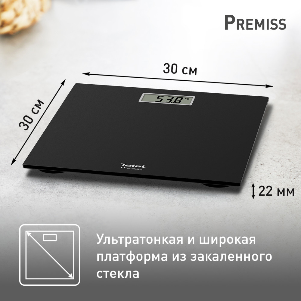 С простыми и удобными напольными весами Premiss от Tefal взвешиваться каждый день или время от времени — легко! Тонкая и широкая платформа весов выполнена из закаленного стекла и выдерживает вес до 150 кг, имеет большой цифровой дисплей и функцию автоматического включения и выключения. Весы имеют широкую платформу 30×30 см и большой дисплей с хорошо читаемыми цифрами. Благодаря ультратонкой платформе высотой всего 22 мм весы выглядят элегантно, и их удобно хранить.