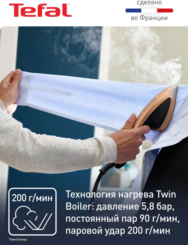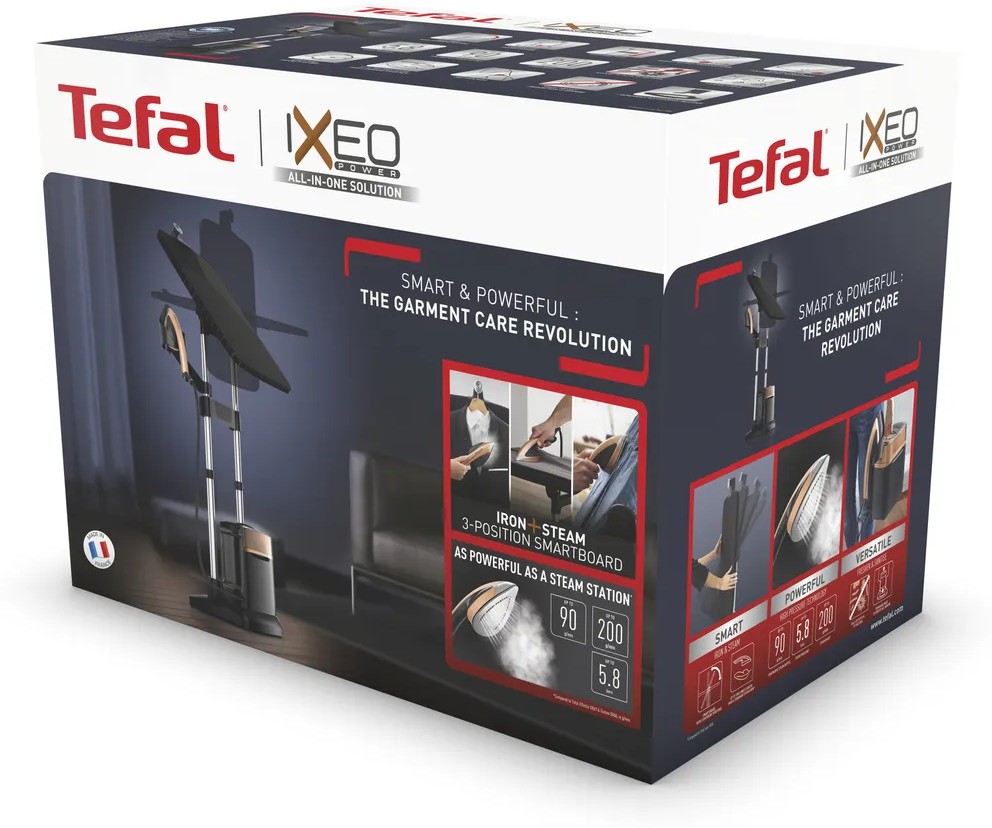 Tefal IXEO предлагает революционный подход в уходе за вещами «3в1». Благодаря сочетанию глажения и отпаривания в одном эргономичном устройстве с гладильной доской вы можете быстро привести любимые вещи в порядок. Давление до 5.8 бар, постоянный пар до 90 г/мин и паровой удар до 200 г/мин позволят вам без лишних усилий справиться с любыми складками.