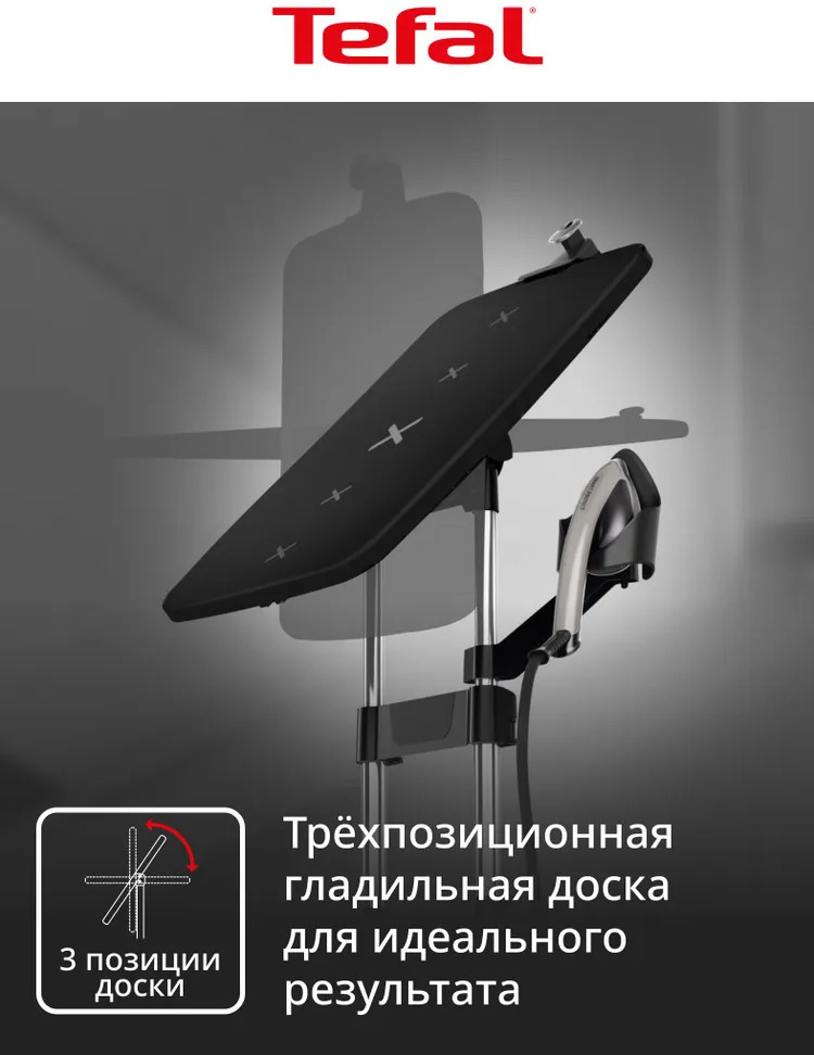 Мощный постоянный пар до 100 г/мин, давление насоса 5,8 бар, паровой удар до 350 г/мин для мгновенного разглаживания стойких складок и три уровня мощности пара для любых типов тканей. Гладильная система оснащена уникальной доской с регулируемым углом наклона для длительных и коротких сессий глажения и отпаривания с лёгкостью и комфортом.