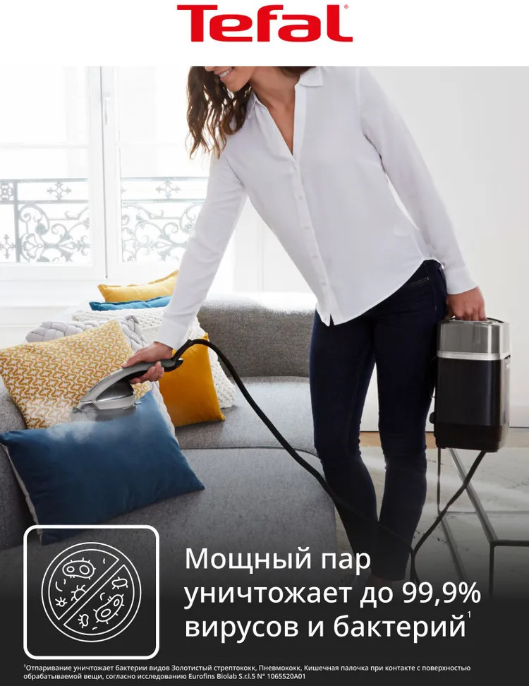 Обработайте паром домашний текстиль, шторы и освежите обивку мягкой мебели там, где вам удобно, благодаря съёмной базе с резервуаром для воды объёмом 1.1 л. Мощная сила пара освежает одежду, устраняет неприятные запахи и уничтожает до 99.99% бактерий, микробов и вирусов.