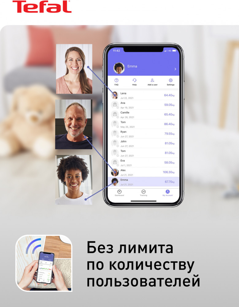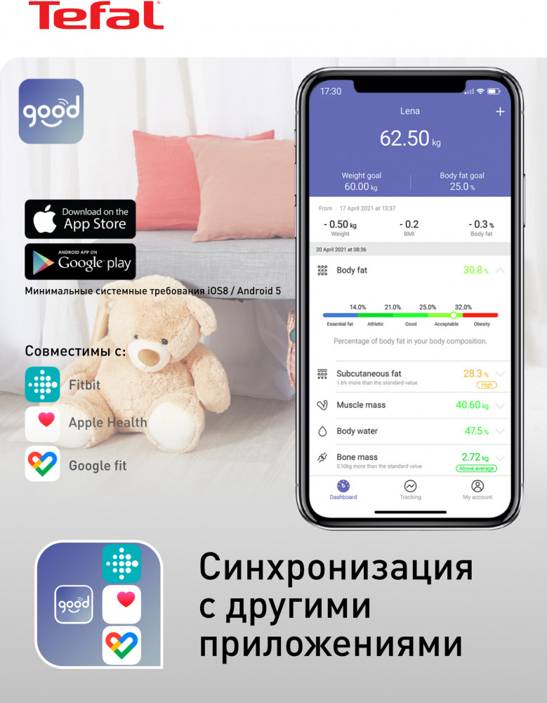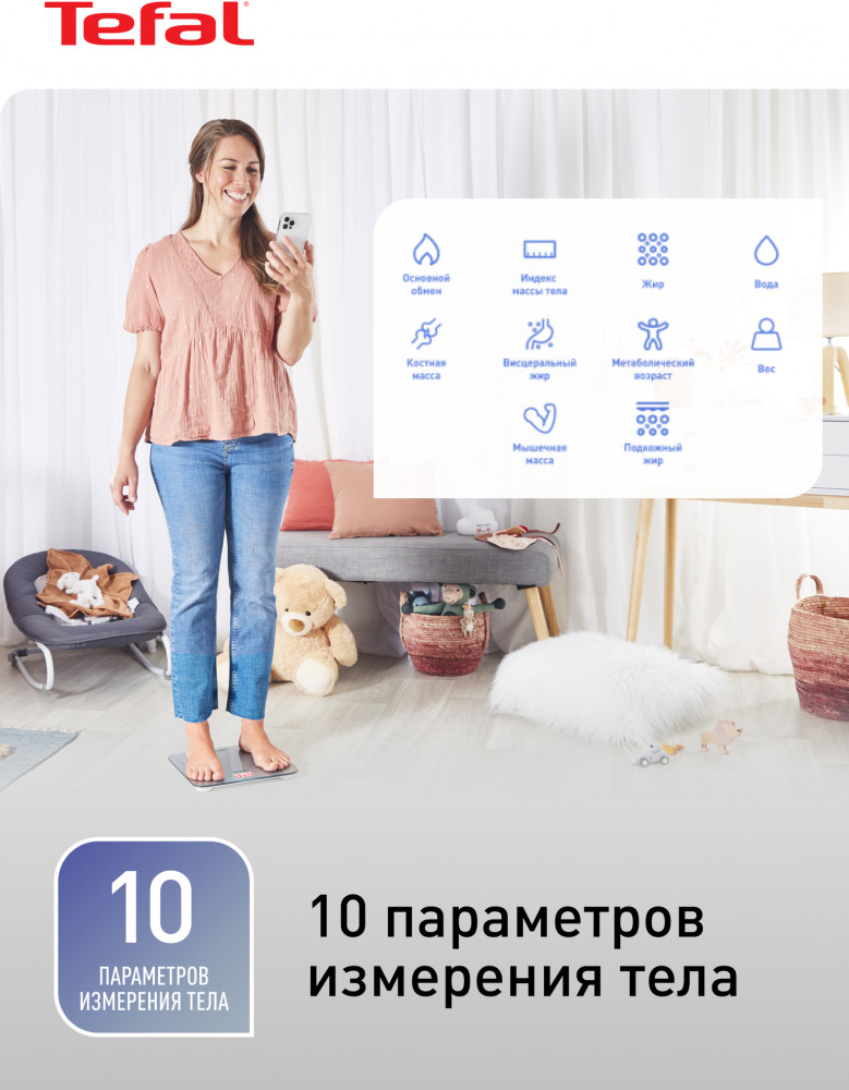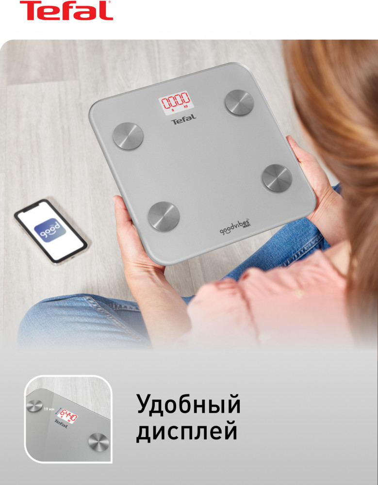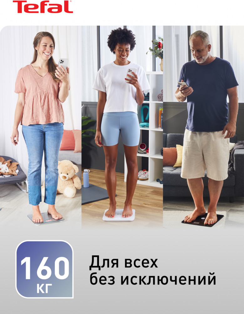 Tefal Goodvibes Life BM9600S1 — умные весы с приложением помогают лучше узнавать себя и помогают отслеживать 10 параметров измерения тела, включая вес, ИМТ, жировую массу, мышечную массу, костную массу, количество воды в организме, висцеральный жир, подкожно-жировую клетчатку, уровень метаболизма и метаболический возраст. Итоговый показатель наглядно отображается на крупном и чётком дисплее. Кроме того, эта и дополнительная информация может быть выведена на экран телефона, планшета или умных часов. Весы имеют максимальный предел взвешивания 160 кг и показывают вес с точностью до 100 г. Платформа сделана из качественного закалённого стекла — оно очень прочное, и к нему приятно прикасаться. На основании корпуса предусмотрены прорезиненные ножки, препятствующие скольжению прибора на кафеле в ванной комнате.