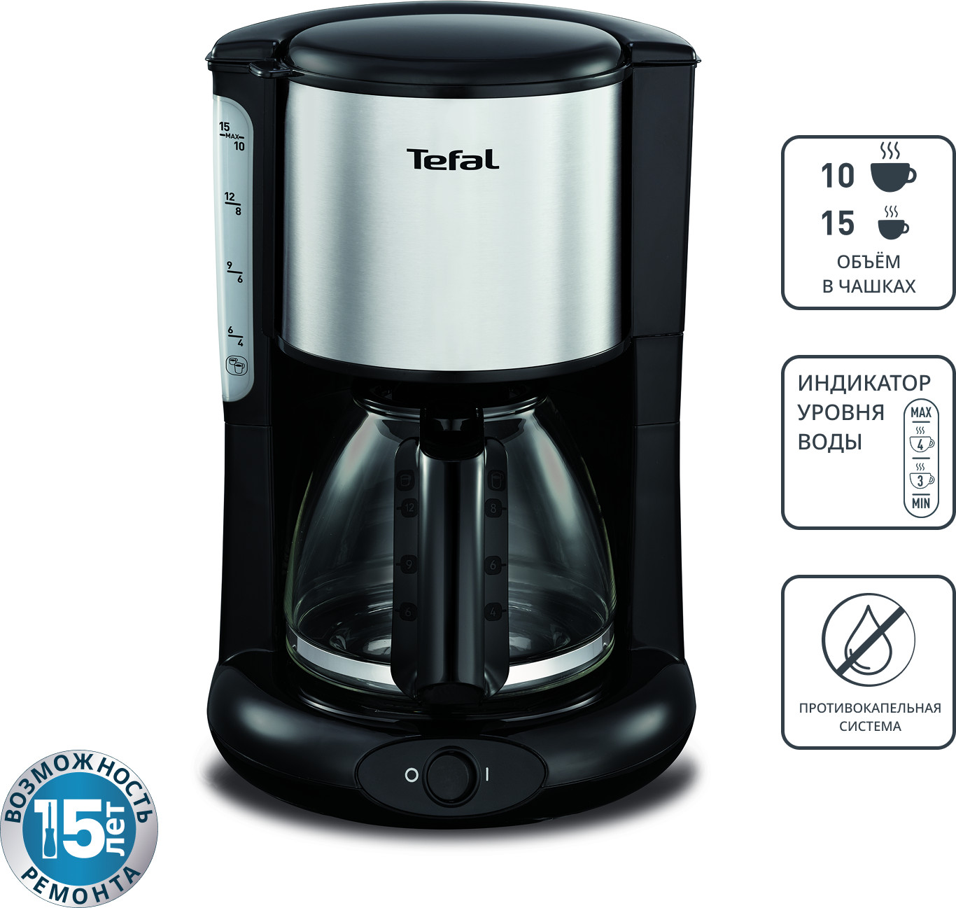 Серия: Confidence Капельная кофеварки Tefal CM361838 использует молотый кофе, то есть не предусматривает встроенной кофемолки. Модель предусматривает противокапельную систему, то есть окончание процесса приготовления кофе запускает механизм остановки подачи воды. До 1,25 л. или 15 чашек горячего кофе. Стеклянный кувшин можно подогревать в микроволновой печи. Специальный фильтр для кофе не требует замены и легко моется под проточной водой. Уникальная система «Капля-стоп» остановит подачу воды вовремя, предотвратив попадание капель кофе на подставку под кувшин и на поверхность вокруг кофеварки |