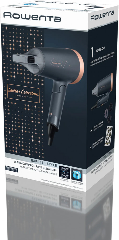 Серия: Express Style Коллекция Stellar от Rowenta поднимет ваш ежедневный ритуал ухода за собой на новый уровень. Она не только обеспечит вам великолепный вид за считанные минуты, но и порадует особым, прекрасным дизайном. Откройте преимущества каждого прибора в коллекции, включая фен Express Style для быстрой сушки и укладки без лишних усилий. |