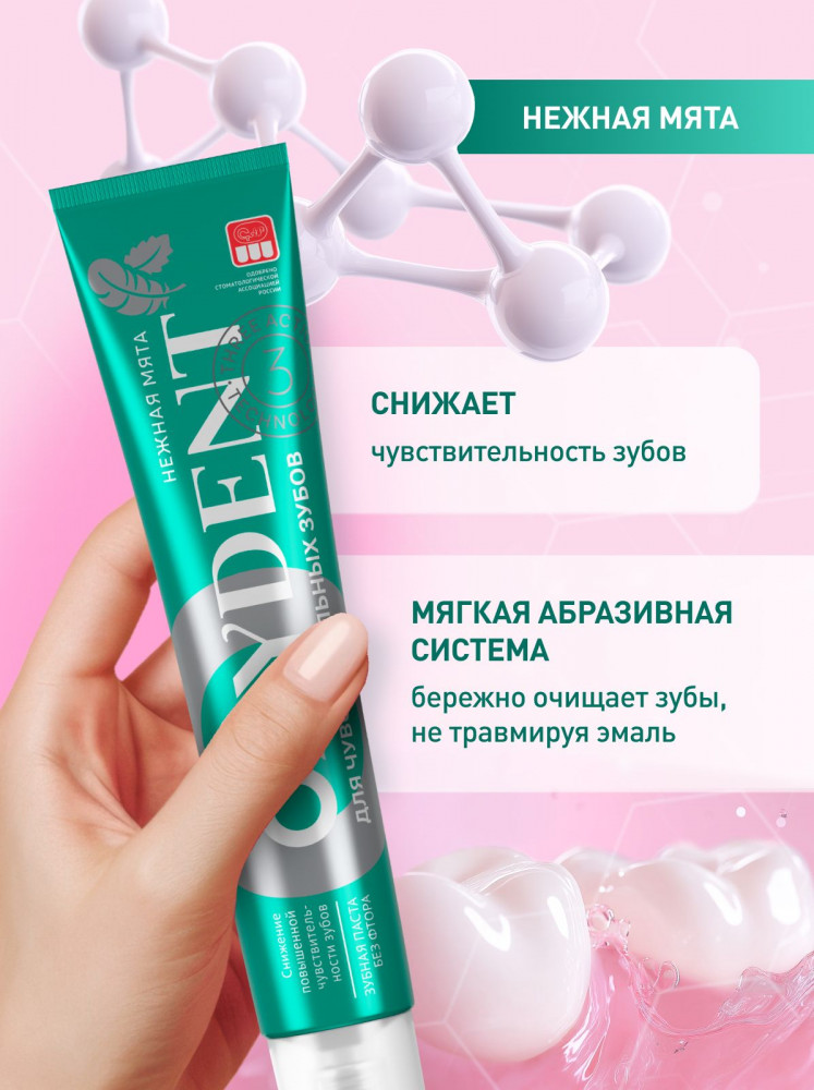 Зубная паста для чувствительных зубов со вкусом нежной мяты поддерживает оптимальный баланс микрофлоры полости рта и укрепляет эмаль. Минерал гидроксиапатит проникает в мельчайшие трещинки и формирует защитный минеральный слой. Мягкая абразивная система позволяет бережно очищать зубы, не травмируя эмаль. Благодаря комплексу эффективных компонентов в составе зубная паста способствует уменьшению неприятных ощущений, вызванных повышенной чувствительностью зубов. Содержит в своём составе калия нитрат — активный компонент, способствующий снижению чувствительности зубов. Механизм действия заключается в блокировке передачи нервных импульсов, вследствие чего уменьшается болевое ощущение. Уникальный комплекс 3 Action Technology с доказанной эффективностью оказывает комплексное действие благодаря трём активным компонентам: гидроксиапатиту, экстракту морских водорослей Lithothamnium и специальному полимеру PVP.