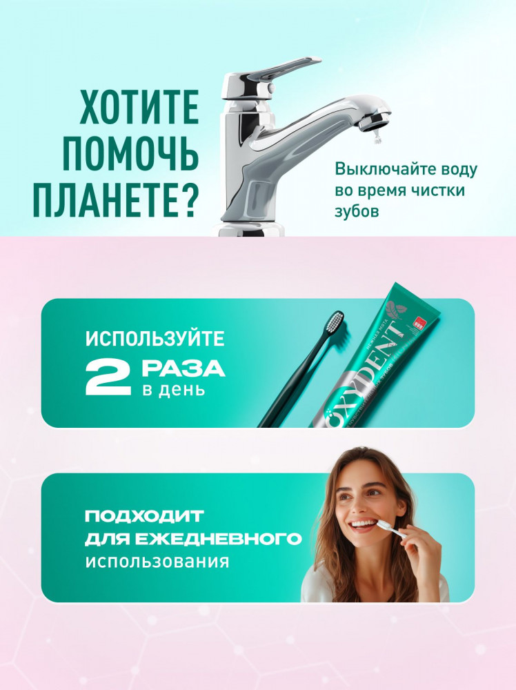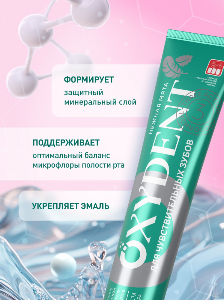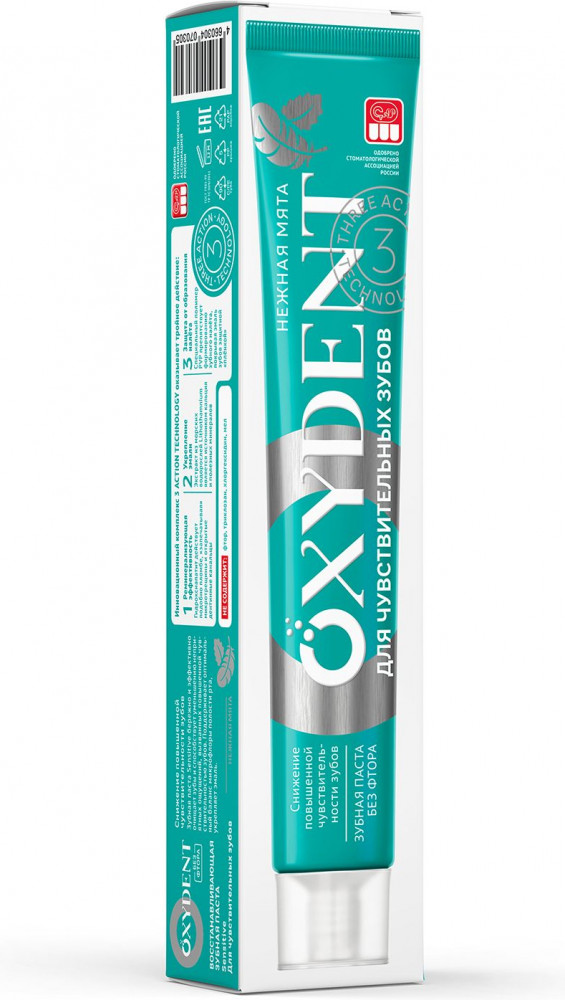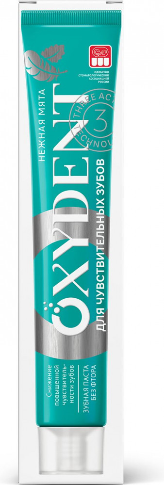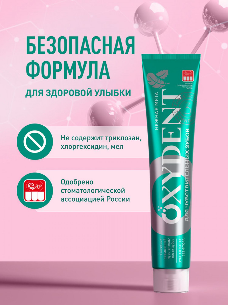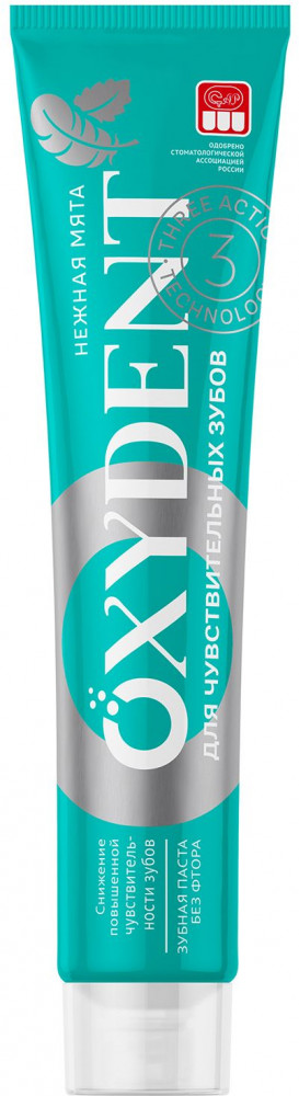 Зубная паста Oxydent идеально подходит для ежедневного использования и рекомендована к применению Стоматологической Ассоциацией России — крупнейшей профессиональной организацией стоматологов в России. Паста не содержит фтор, триклозан, хлоргексидин, мел. Обеспечивает безупречную чистоту и длительную свежесть дыхания, не травмируя эмаль и не повышая чувствительность зубов.