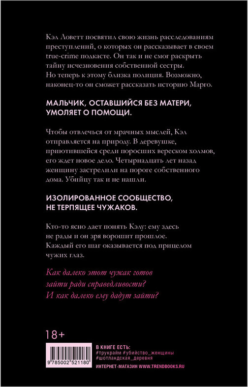 В данный момент этот товар отсутствует в продаже. Возможно, у нас найдется аналогичный или похожий товар здесь. Серия: #trendbooks thriller «Секреты мертвых» Хизер Критчлоу — остросюжетный триллер автора романа «Убитые девушки» Хизер Критчлоу. Вторая история о расследованиях тру-крайм-подкастера Кэла Ловетта. Кэл Ловетт — журналист и автор true crime подкаста о пропавших без вести людях. Он так и не смог раскрыть тайну исчезновения сестры. Но теперь к этому близка полиция. Чтобы отвлечься, Кэл отправляется на природу, в шотландскую деревушку, где его ждет нераскрытое преступление. Четырнадцать лет назад женщину застрелили на пороге собственного дома. Убийцу так и не нашли. Как далеко готов зайти Кэл ради справедливости? И как далеко ему дадут зайти?