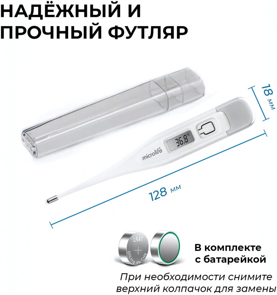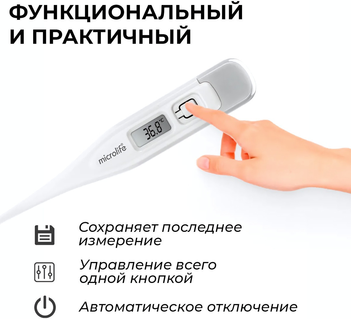 Термометр Microlife MT-600 — надёжный и удобный прибор для точного измерения температуры тела. Оснащён водонепроницаемым корпусом и обеспечивает измерение за 60 секунд. Безопасен в использовании, не содержит ртуть и прошёл клинические испытания. Устройство имеет звуковой сигнал, память последнего измерения, функцию автоматического отключения и индикацию низкого заряда батарейки. Простая замена элемента питания делает использование ещё более удобным и долговечным. |