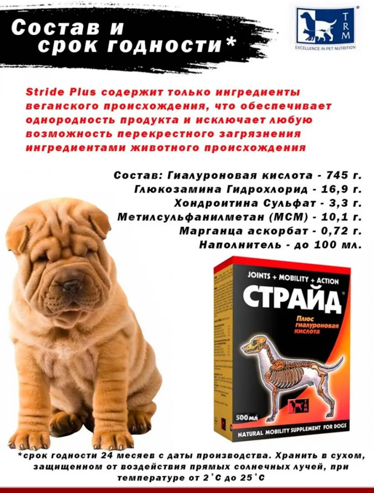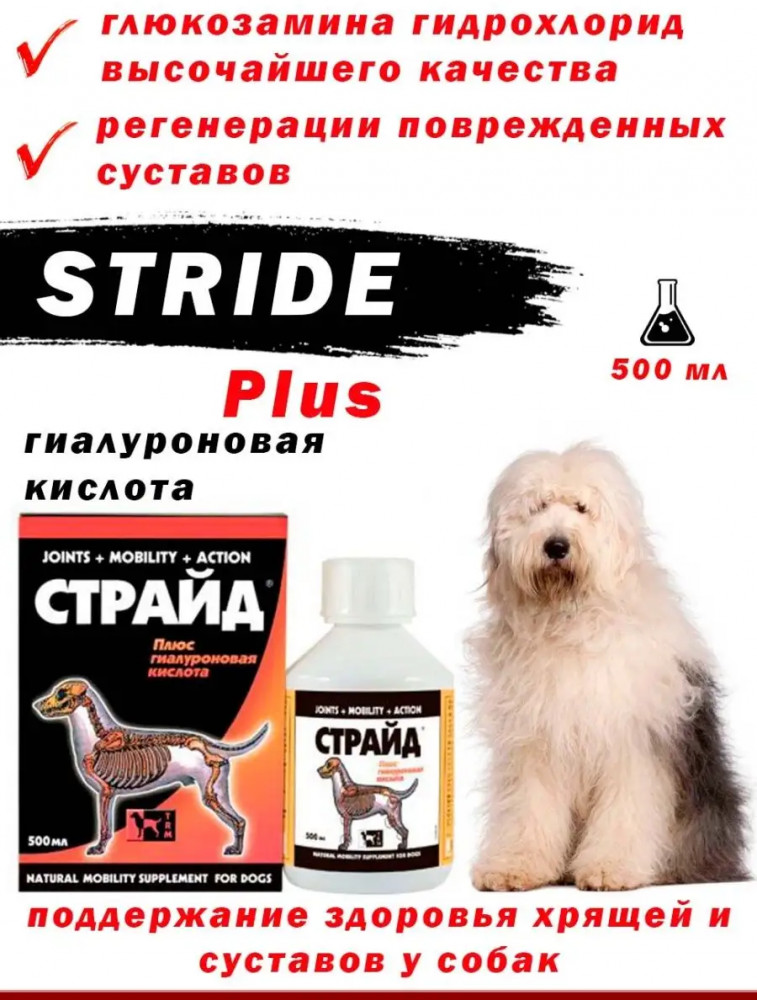 Страйд — это высокоэффективный препарат, относящийся к новому поколению хондропротекторов, предназначенных для профилактики и лечения воспалительных и дегенеративных заболеваний суставов у собак. Рекомендуется щенкам для укрепления хрящевой ткани ушных раковин.