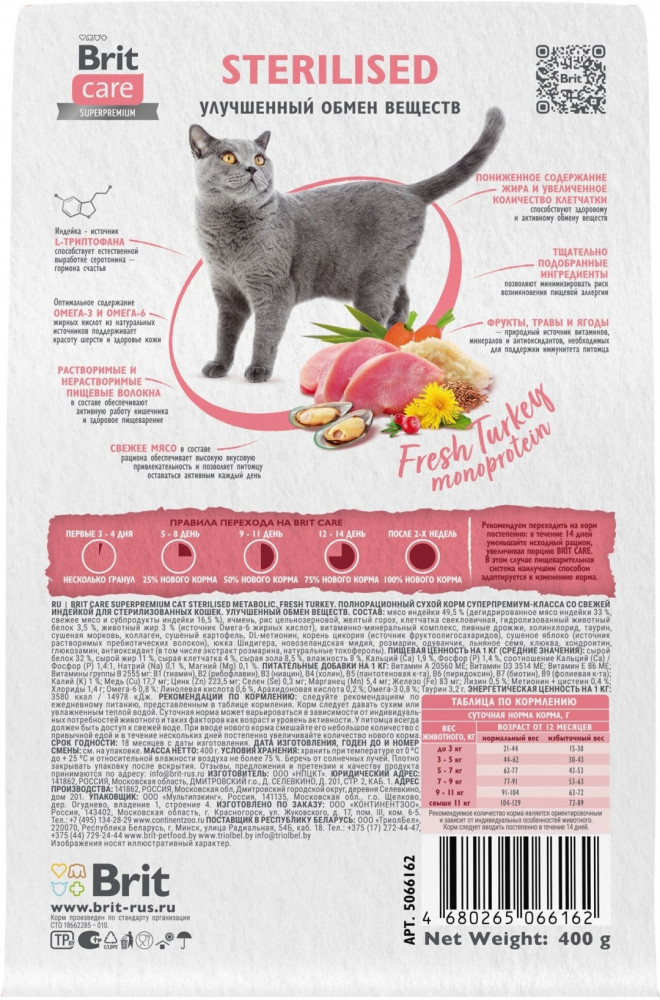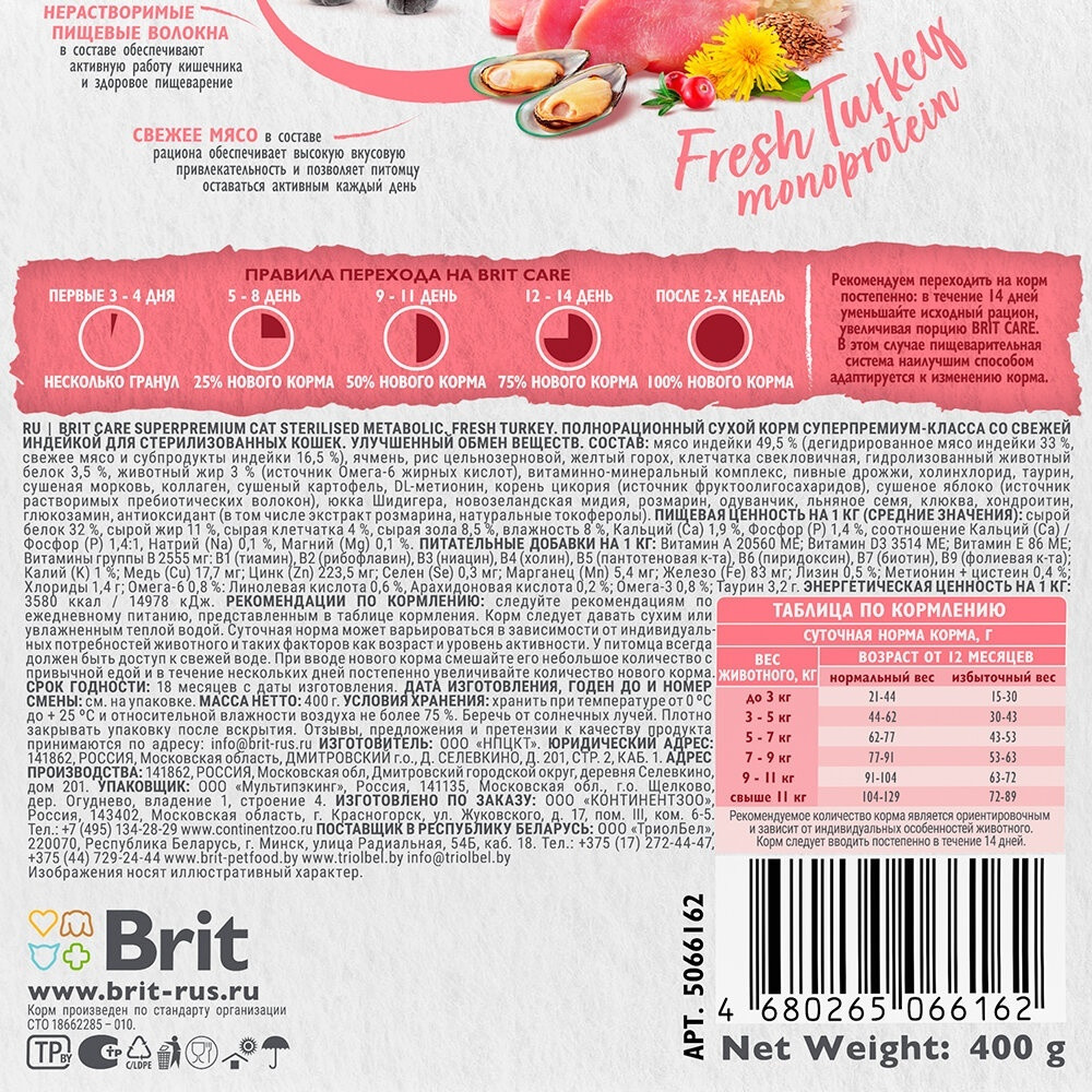 Brit Сухой корм для стерилизованных кошек с индейкой «Sterilised Metabolic»