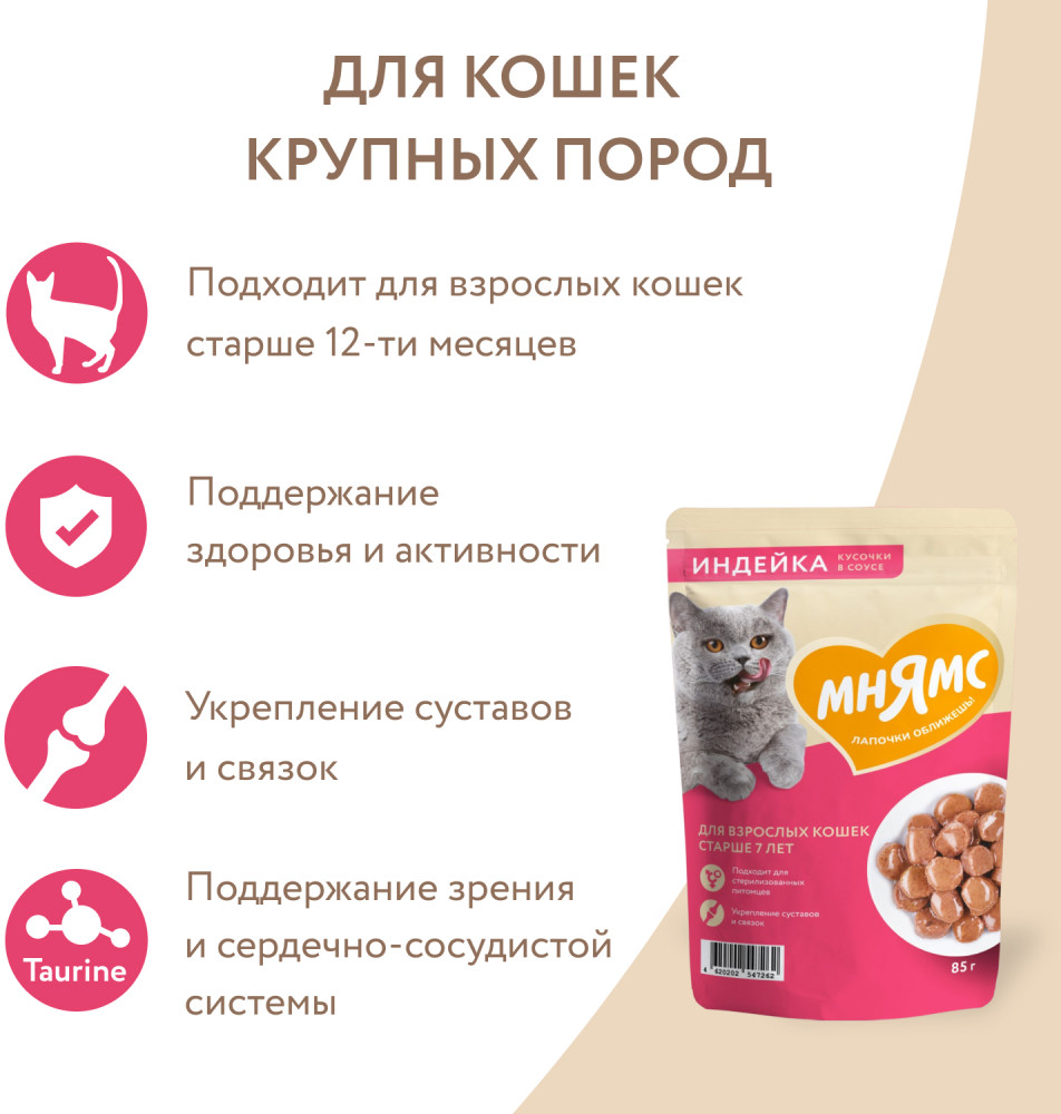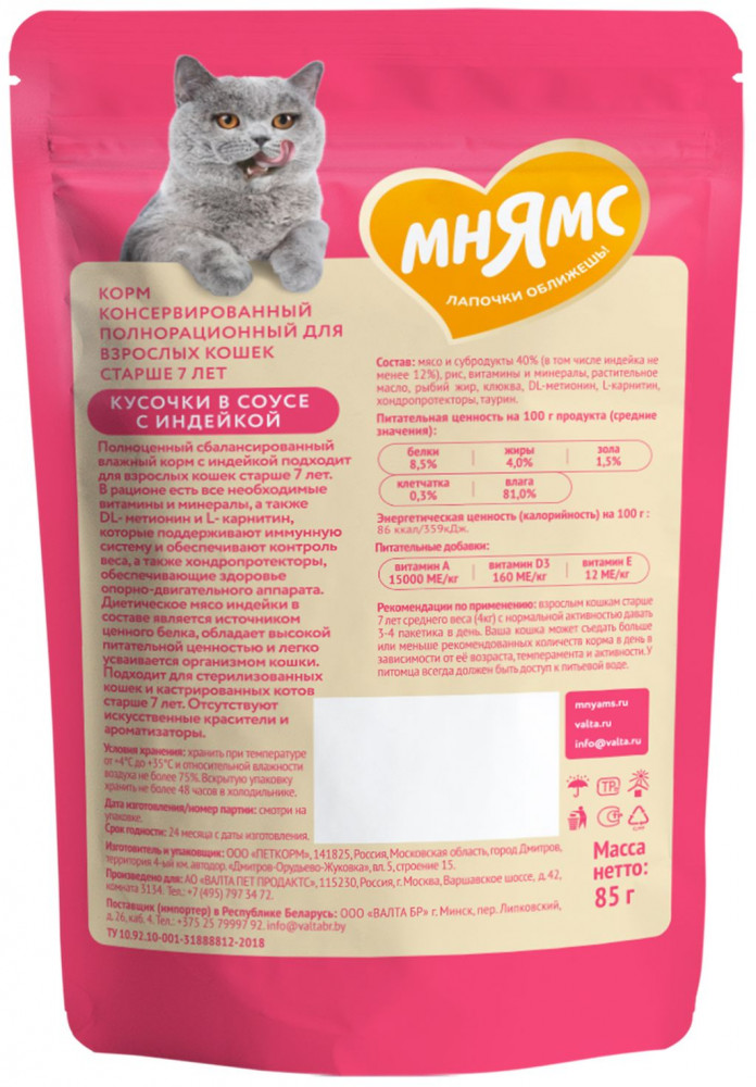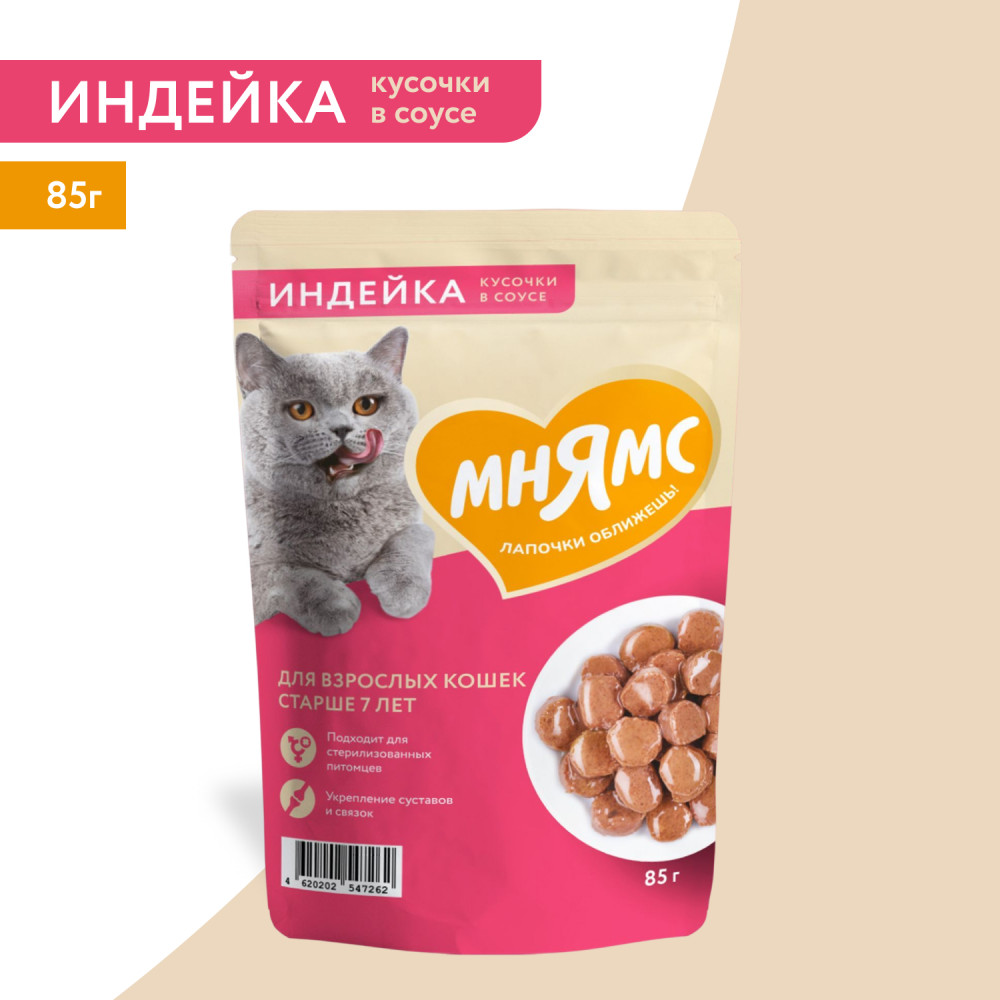 Мнямс Корм для кошек старше 7 лет «Кусочки в соусе с индейкой»