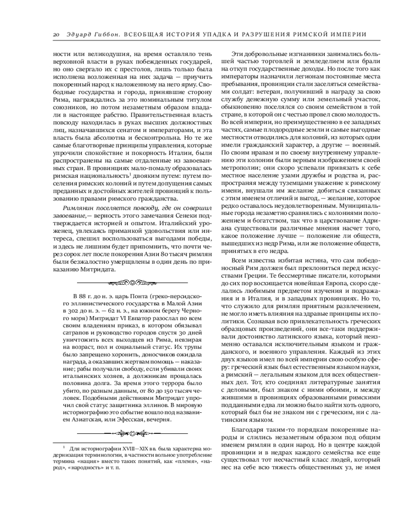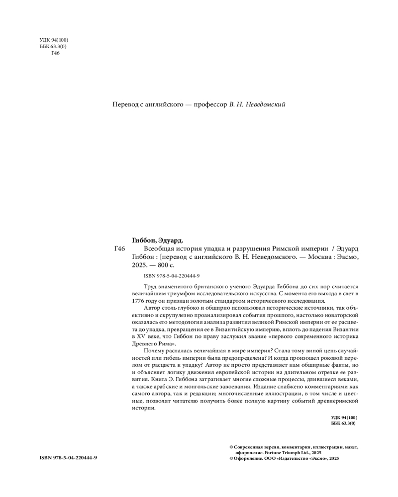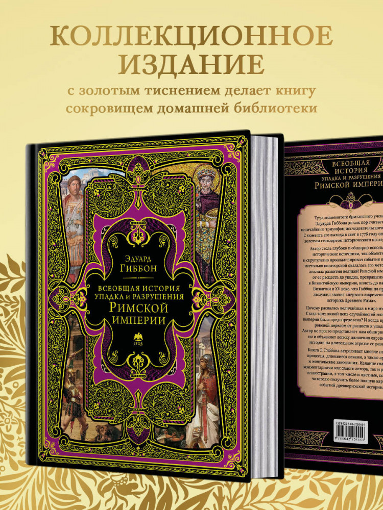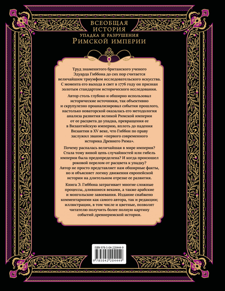 Серия: Подарочные издания. Всеобщая история (новое оформление) Фундаментальный труд Эдуарда Гиббона «История упадка и разрушения Римской империи» является одним из самых влиятельных и впечатляющих исторических произведений европейской литературы, прочно закрепившимся в общих представлениях об эпохе, которую по праву можно считать колыбелью европейской цивилизации. В фокусе исследования Гиббона — более чем тысячелетняя судьба римской цивилизации от «золотого века» империи при династии Антонинов до падения Константинополя под натиском осман в 1453 году. |