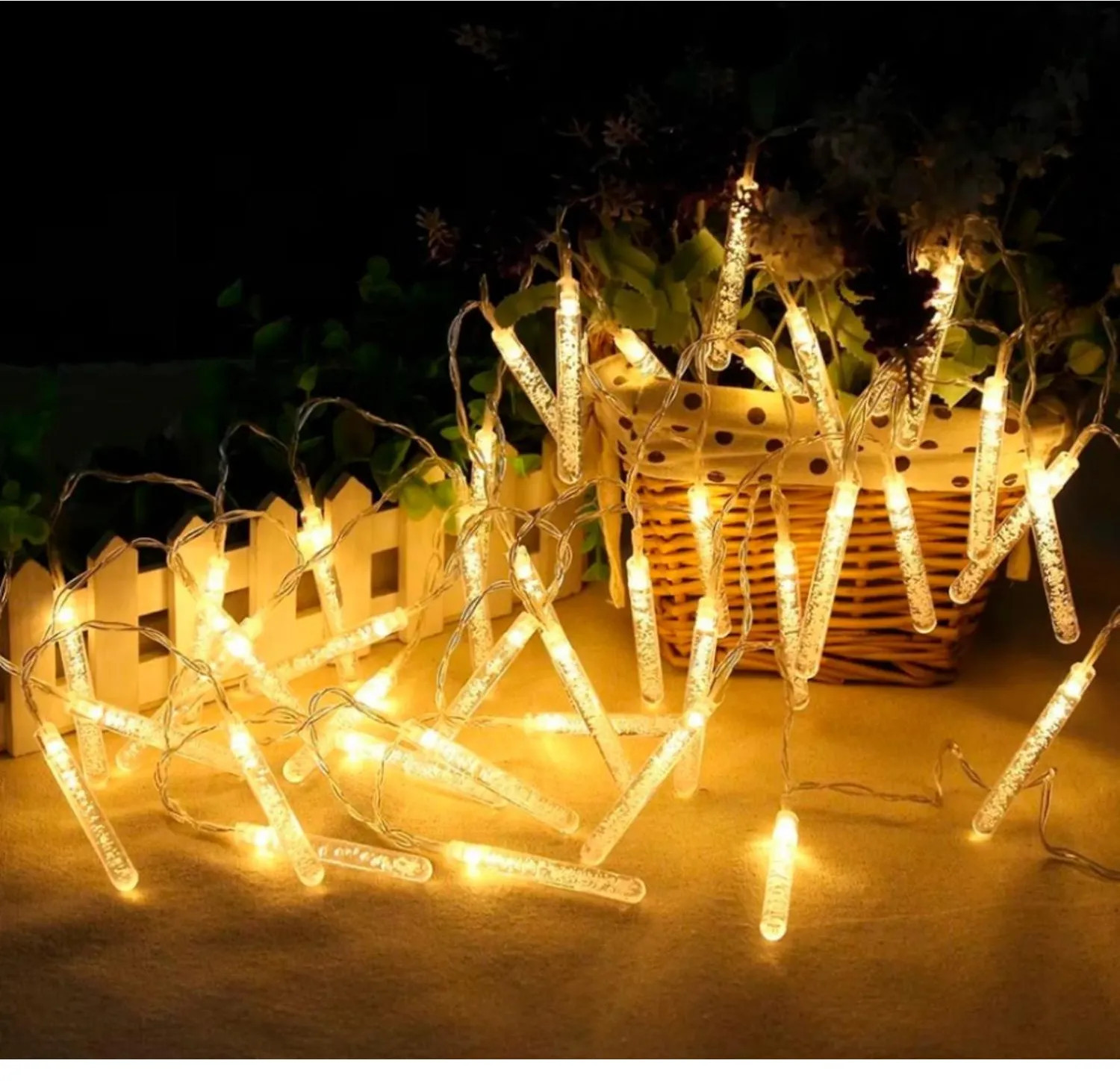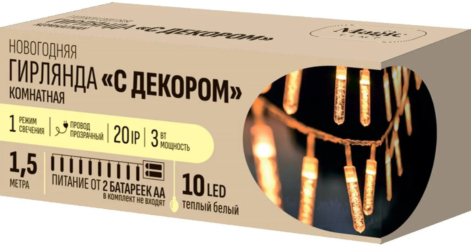 Электрогирлянда Magic Time Сосульки тёплый белый свет 10 светодиодов (1.5 м, 94809). LED-гирлянда может быть использована в помещении. Имеет степень влагозащиты IP 20. Состоит из 10 LED-лампочек тёплого белого света. Провод прозрачный. Размер гирлянды — 150 см, длина шнура — 25 см, размер сосульки 7,5 см, напряжение 1,2 В, мощность 3 Вт, сила тока 0,4 А, 1 режим. Питание от 2-х АА батареек. |
