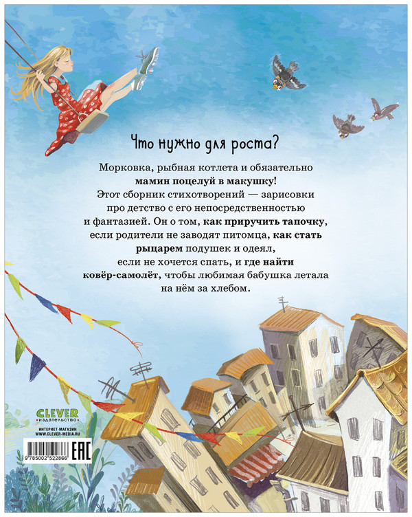 💳 Оплатить за товар можно при получении 🇰🇿 Есть бесплатная доставка по Казахстану 🎁 Копите бонусы с каждой покупки Что нужно для роста? Морковка, рыбная котлета и обязательно мамин поцелуй в макушку! Этот сборник стихотворений — зарисовки про детство с его непосредственностью и фантазией. Он о том, как приручить тапочку, если родители не заводят питомца, как стать рыцарем подушек и одеял, если не хочется спать, и где найти ковёр-самолёт, чтобы любимая бабушка летала на нём за хлебом. |