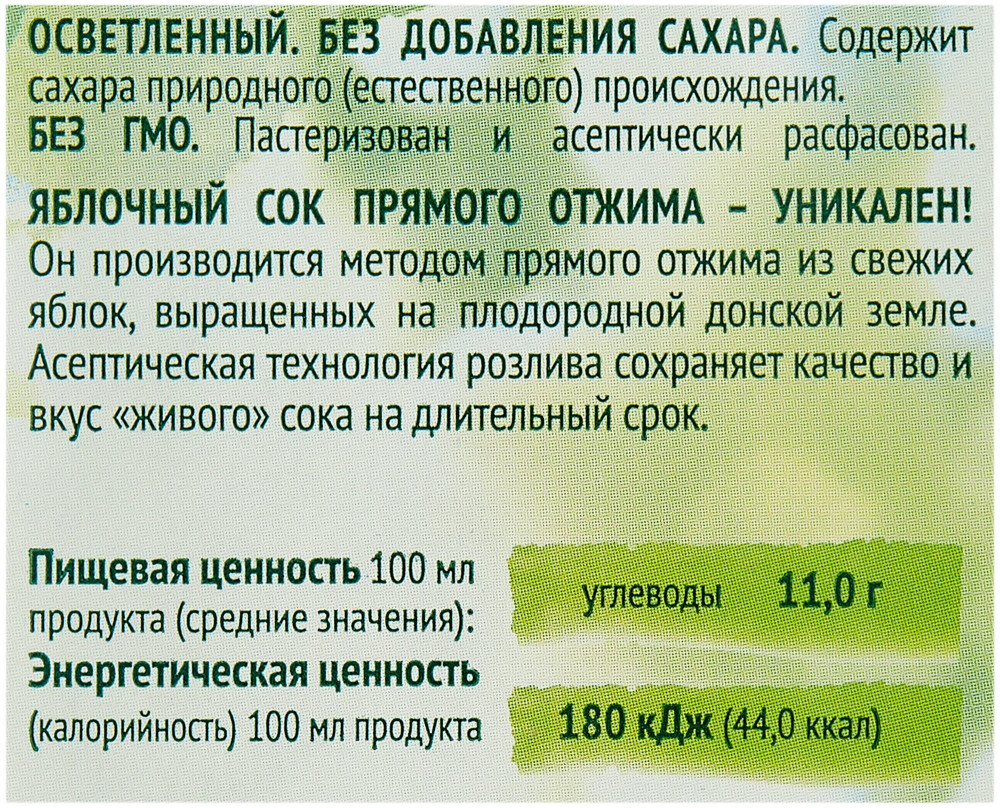 Настоящий яблочный сок прямого отжима Сады Придонья без добавления сахара — истинная находка для тех, кто следит за своим здоровьем и фигурой! Яблочный сок прямого отжима — уникален, ведь он производится методом прямого отжима свежих яблок высшего сорта, выращенных на плодородной донской земле. Щадящая температура пастеризации и короткое время этой процедуры позволяют сохранить яркий свежий вкус и важные полезные свойства, присущие плодам. В 200 граммах такого сока содержится до 20% суточной нормы витамина С, большое количество органической яблочной кислоты и фруктозы, а также важные для жизни микроэлементы — железо и калий.