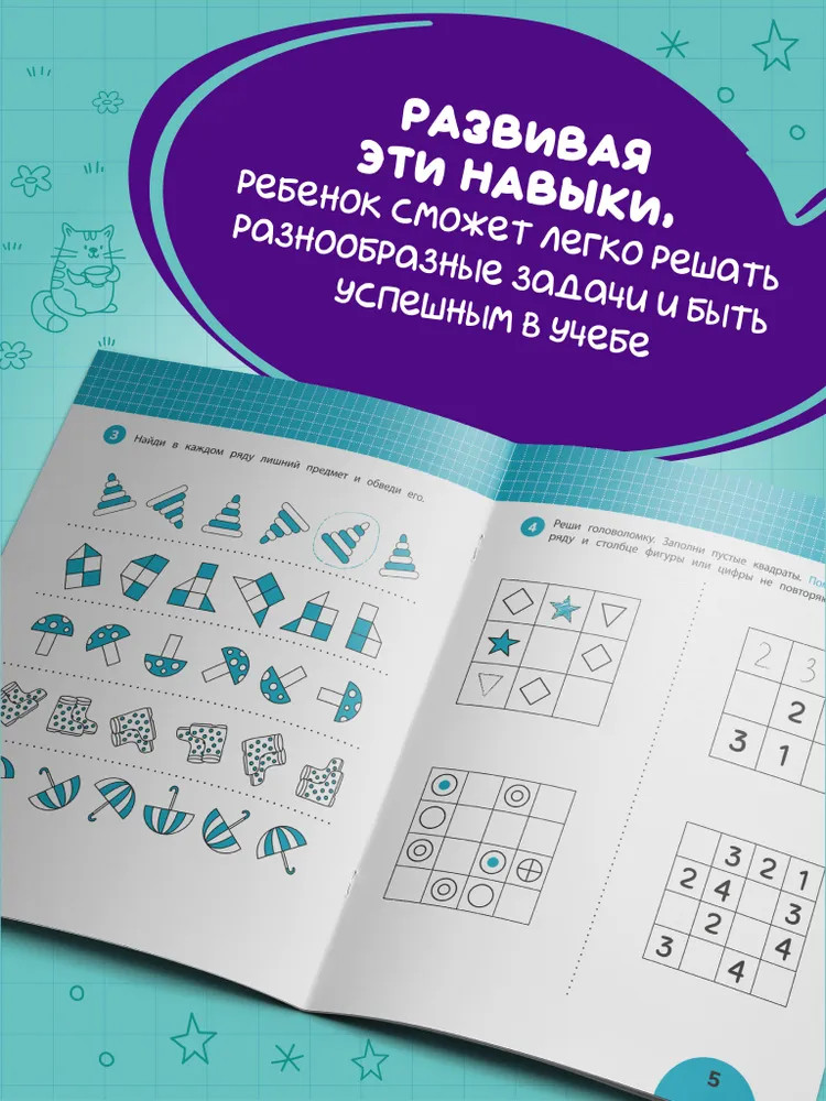 Серия: Smart-старт Каждая книга серии «Smart-старт» — это система заданий и упражнений, направленная на развитие конкретного познавательного навыка. Яркие и интересные задания разработаны с упором на визуальную инструкцию, что позволяет ребёнку легко (нативно) понимать и выполнять упражнения без участия взрослого. Данное пособие направлено на тренировку основных приёмов мышления (сравнение, анализ, синтез, классификация, закономерности и т. д.). Развивая эти навыки, ваш ребёнок сможет легко решать разнообразные задачи и быть успешным в учебной деятельности. Пособие предназначено детям старшего дошкольного возраста и младшего школьного возраста. |
