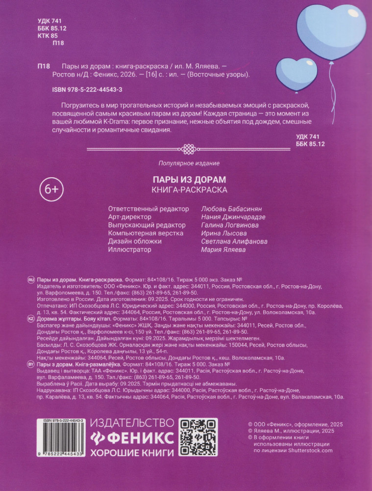 Серия: Восточные узоры Погрузитесь в мир трогательных историй и незабываемых эмоций с раскраской, посвященной самым красивым парам из дорам! Каждая страница — это момент из вашей любимой K-Drama: первое признание, нежные объятия под дождем, смешные случайности и романтичные свидания. |
