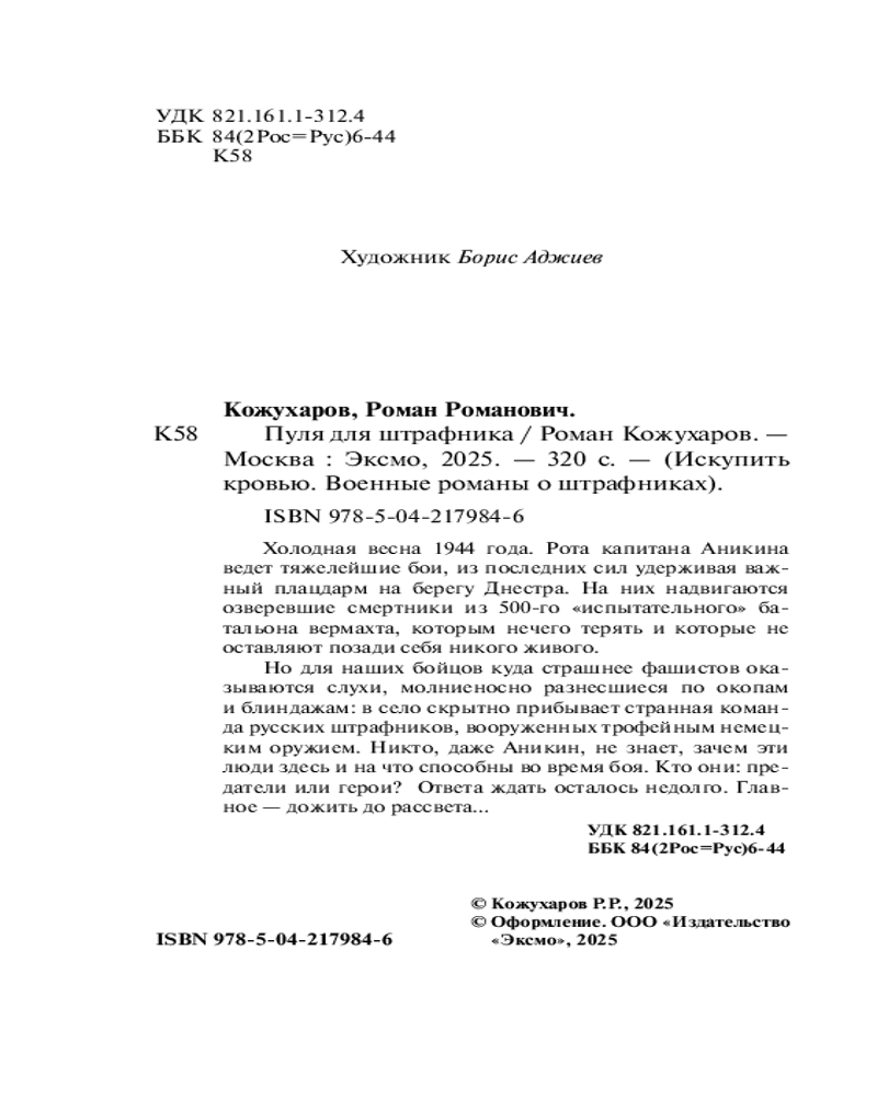 Серия: Искупить кровью. Военные романы о штрафниках Книга основана на реальных воспоминаниях ветеранов Великой Отечественной войны Сергея Кожухаря и Ивана Мельникова и погружает в суровую действительность штрафных подразделений Красной Армии. От плена и побегов до кровавых боев на Курской дуге и штурма Берлина — это не просто история войны, это история людей, их боли, отваги и непоколебимой веры в Победу. Холодная весна 1944 года. Рота капитана Аникина ведет тяжелейшие бои, из последних сил удерживая важный плацдарм на берегу Днестра. На них надвигаются озверевшие смертники из 500-го «испытательного» батальон вермахта, которым нечего терять и которые не оставляют позади себя никого живого. |