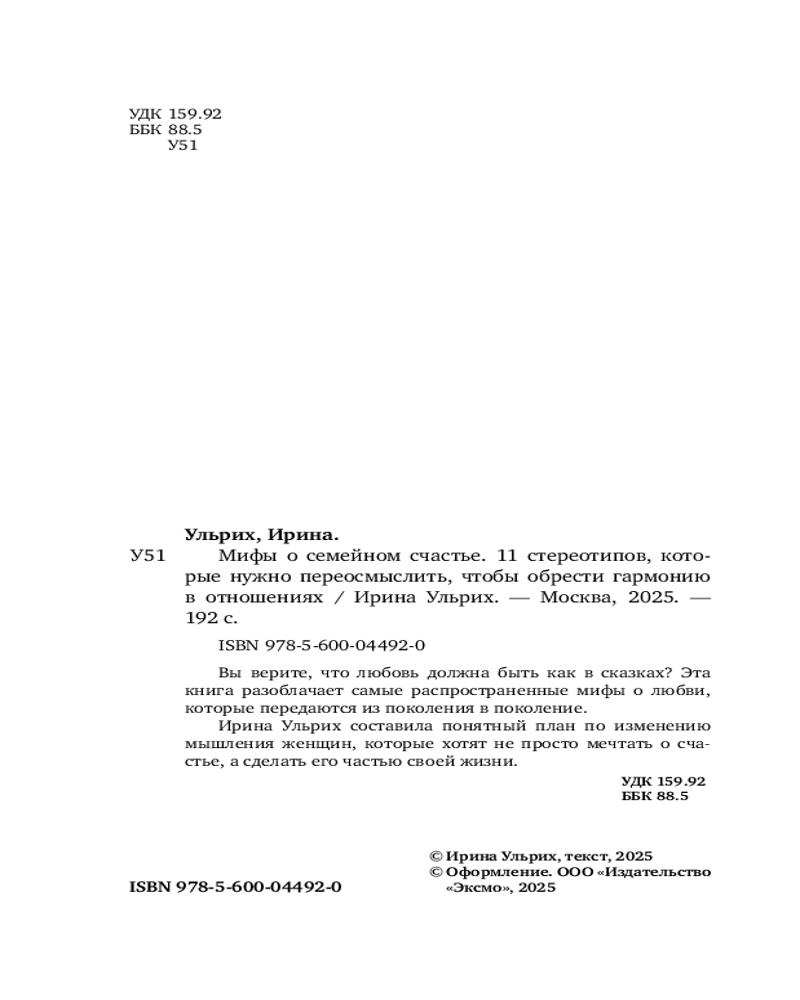 Серия: Психология осмысленной жизни. Книги, которые помогают делать правильный выбор Книга, которая откроет вам глаза на то, что мешает настоящей любви, и подскажет путь к зрелым, счастливым отношениям. Вы уверены, что знаете, как построить счастливый брак? А что, если ваши представления — это всего лишь мифы, впитанные с детства из сказок, фильмов и советов самых близких людей? Автор книги Ирина Ульрих детально разобрала 11 ключевых стереотипов, которые мешают женщинам обрести гармонию в отношениях. |