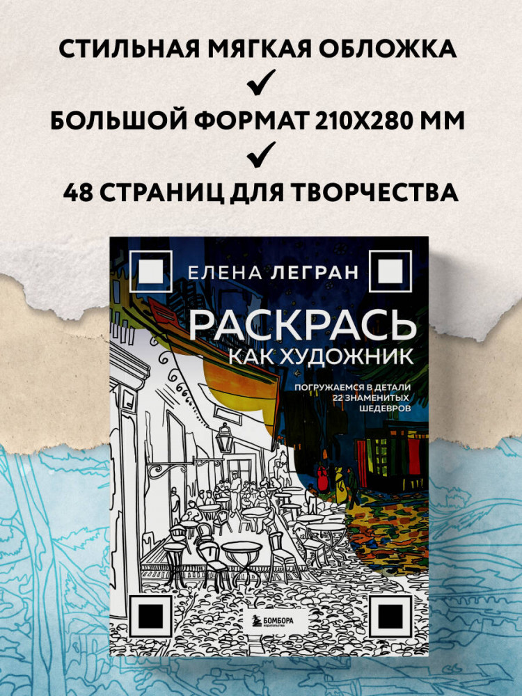 Серия: Код художника. Раскрываем тайны живописи с Еленой Легран Новая раскраска «Раскрась как художник. Погружаемся в детали 22 знаменитых шедевров» предлагает уникальный опыт: возможность самому создать известные картины великих мастеров — шаг за шагом, мазок за мазком. На ее страницах собрано 22 гениальных произведения, изменивших ход мировой живописи — от Леонардо до Магритта, — и каждый шедевр здесь не просто для просмотра, а для со-творчества. Это настоящая арт-терапия и глубокое погружение в мир художественного творчества, где тексты от Елены Легран — известного искусствоведа, историка и автора книг-бестселлеров по искусству — раскроют вам секреты истории каждой картины, мотивы и вдохновение ее создателей. |