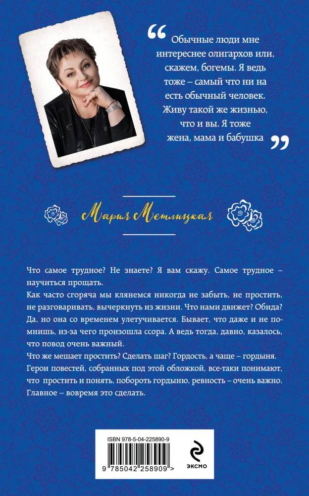 Серия: Негромкие люди Марии Метлицкой. Проза разных лет (обложка) Что самое трудное? Не знаете? Я вам скажу. Самое трудное — научиться прощать. Как часто сгоряча мы клянемся никогда не забыть, не простить, не разговаривать, вычеркнуть из жизни. Что нами движет? Обида? Да, но она со временем улетучивается. Бывает, что даже и не помнишь, из-за чего произошла ссора. А ведь тогда, давно, казалось, что повод очень важный. Что же мешает простить? Сделать шаг? Гордость, а чаще — гордыня. Герои повестей, собранных под этой обложкой, все-таки понимают, что простить и понять, побороть гордыню, ревность — очень важно. Главное —вовремя это сделать. |