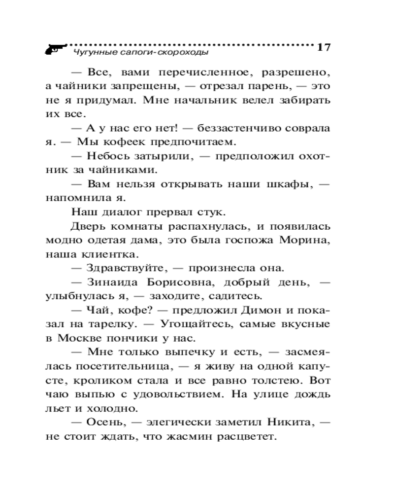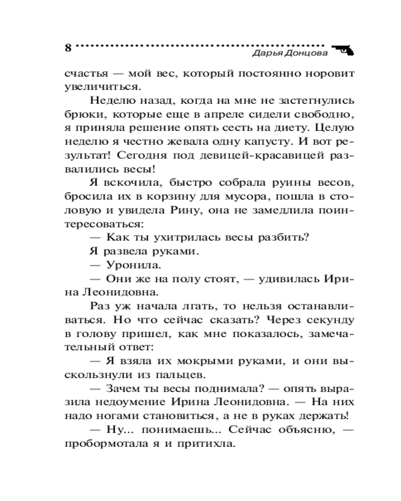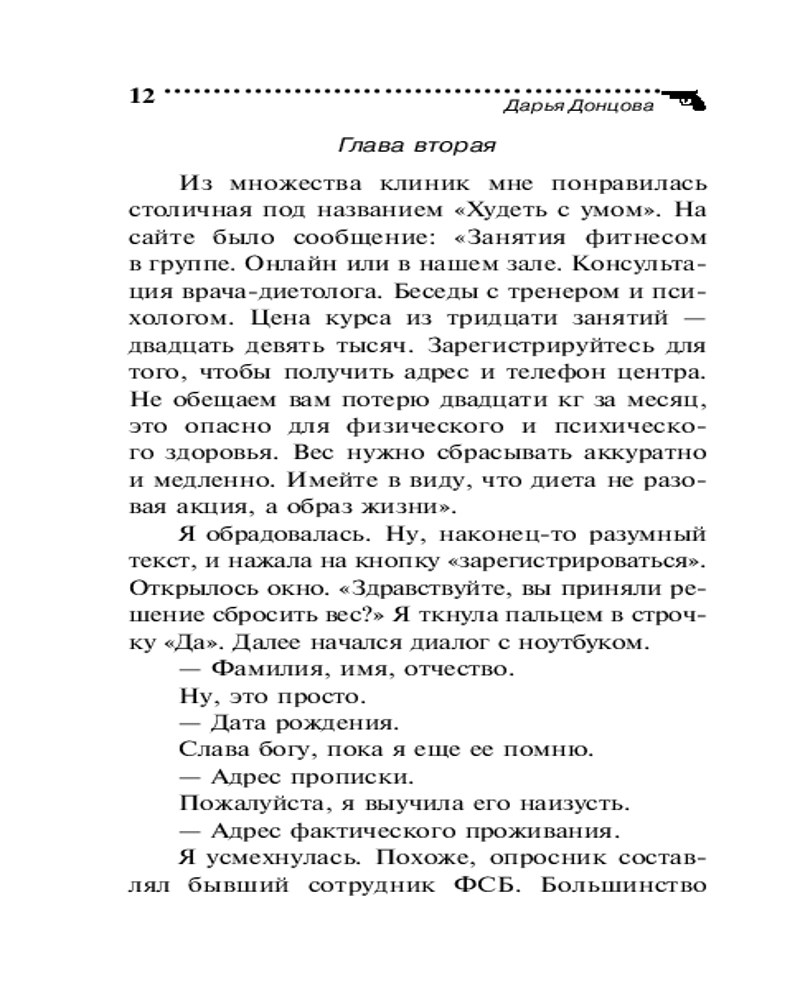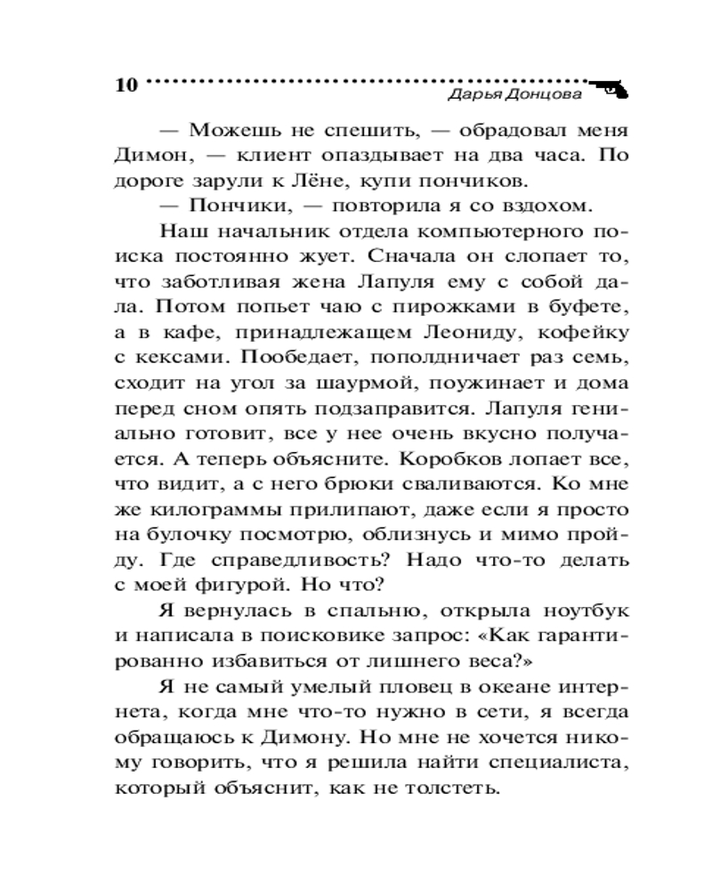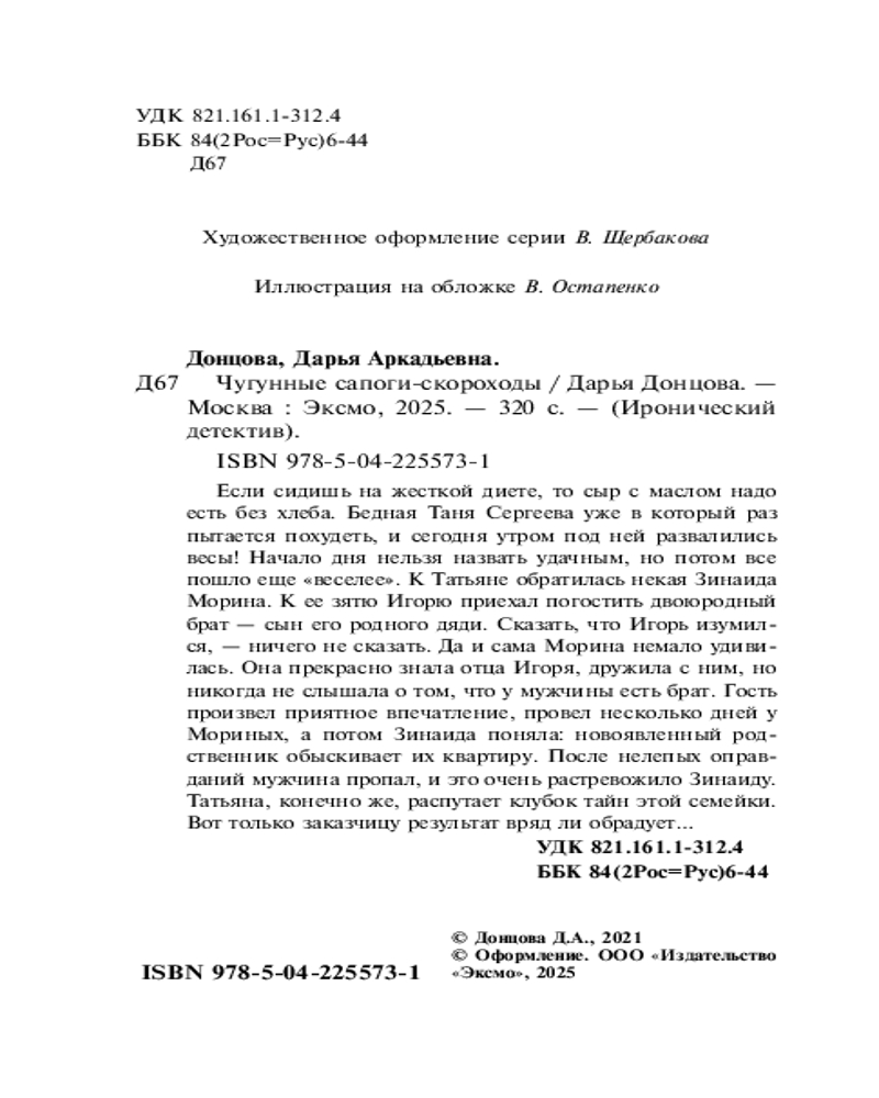 Серия: Иронический детектив Д. Донцовой (эконом) (обложка) Если сидишь на жесткой диете, то сыр с маслом надо есть без хлеба. Бедная Таня Сергеева уже в который раз пытается похудеть, и сегодня утром под ней развалились весы! Начало дня нельзя назвать удачным, но потом все пошло еще «веселее». К Татьяне обратилась некая Зинаида Морина. К ее зятю Игорю приехал погостить двоюродный брат — сын его родного дяди. Сказать, что Игорь изумился — ничего не сказать. Да и сама Морина немало удивилась. Она прекрасно знала отца Игоря, дружила с ним, но никогда не слышала о том, что у мужчины есть брат. Гость произвел приятное впечатление, провел несколько дней у Мориных, а потом Зинаида поняла: новоявленный родственник обыскивает их квартиру. После нелепых оправданий мужчина пропал, и это очень растревожило Зинаиду. Татьяна, конечно же, распутает клубок тайн этой семейки. Вот только заказчицу результат вряд ли обрадует... |