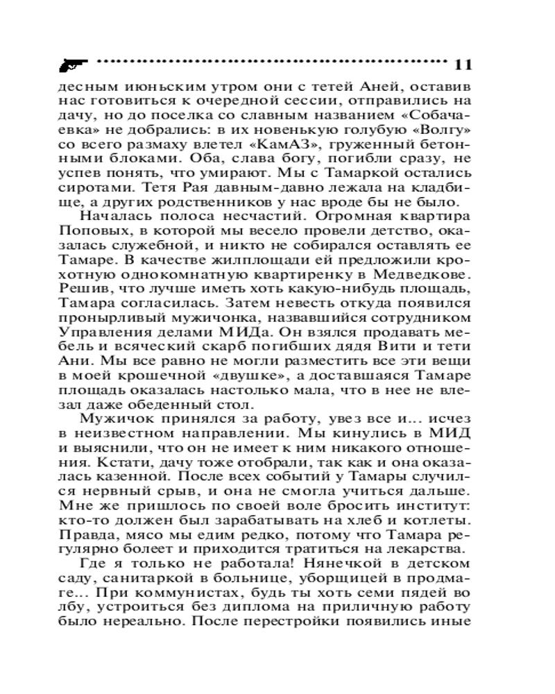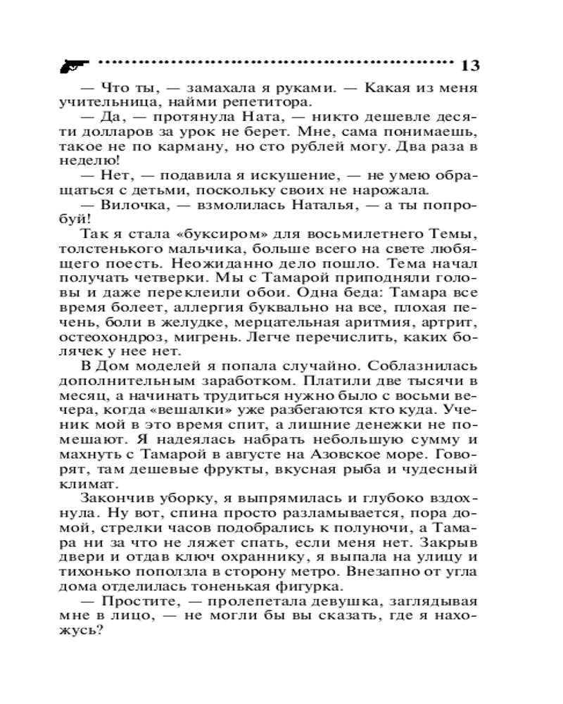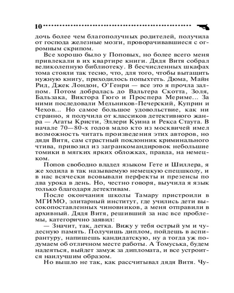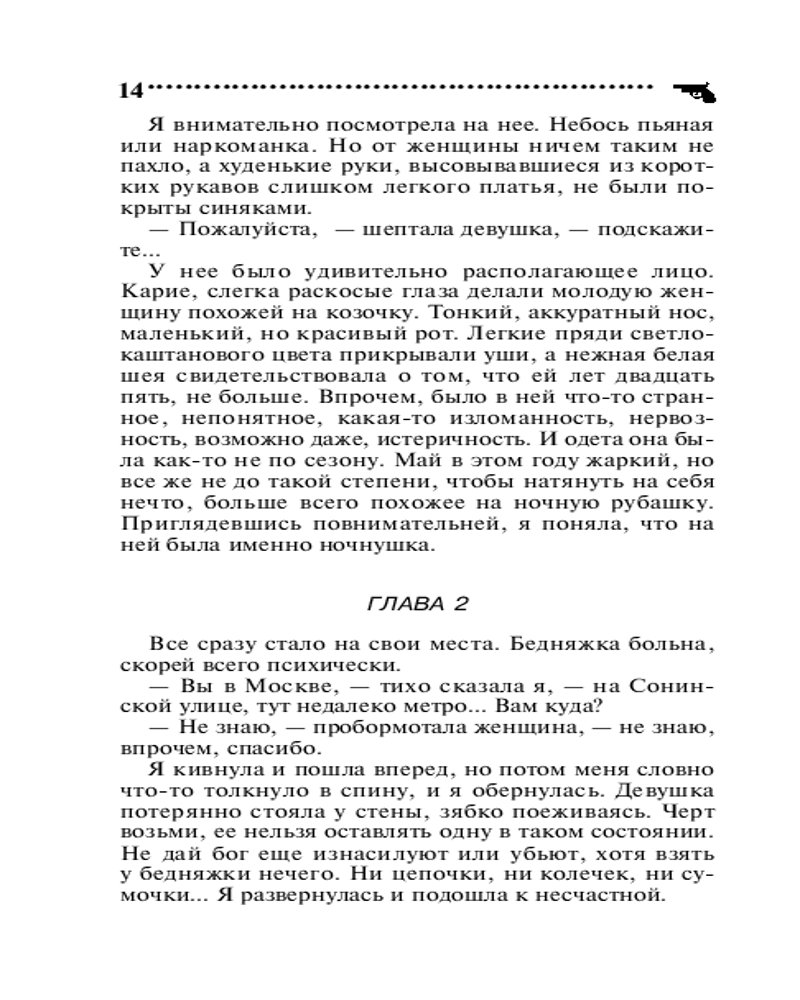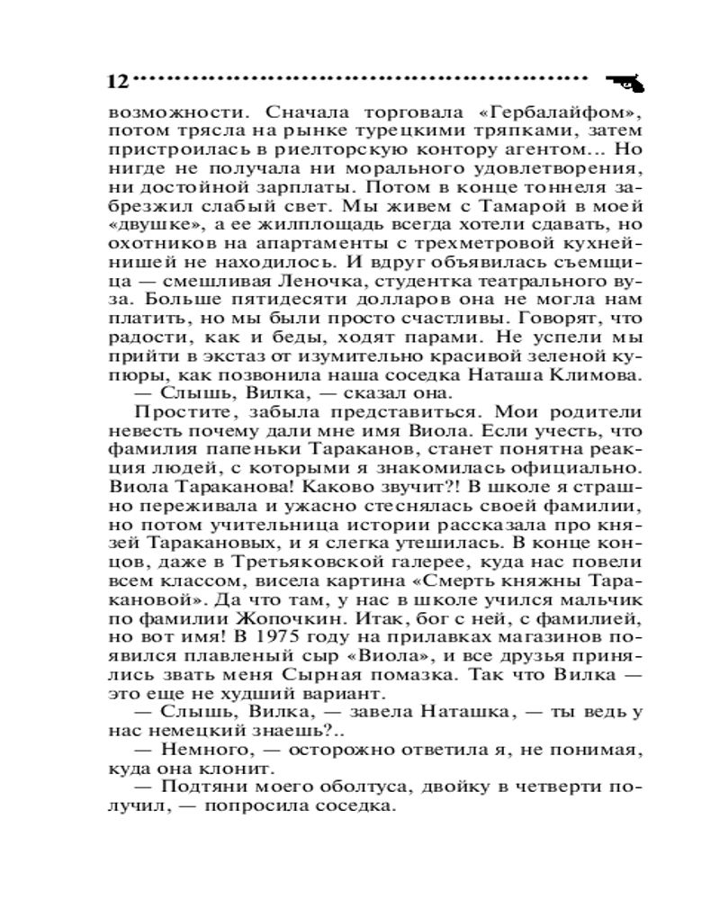 Серия: Лучшие детективы Донцовой (обложка) Ну и имечком наградили меня родители! Представляете сочетание — Виола Тараканова. Но родные и близкие называют меня просто Вилкой. Тяжело мне живется с таким именем, хронически не везет. Вернее, не везло, до того дня, когда я встретила на улице потерявшую память девушку. С этого момента вся моя жизнь изменилось. Решив отыскать родственников Веры, я обнаружила, что нашла свое настоящее призвание. Раньше я любила читать детективы, а теперь поняла, что нет ничего интереснее, чем самой быть детективом. Только я потянула за первую ниточку этого дела, как наткнулась сразу на три трупа. Да, круто начинается мое первое расследование... |