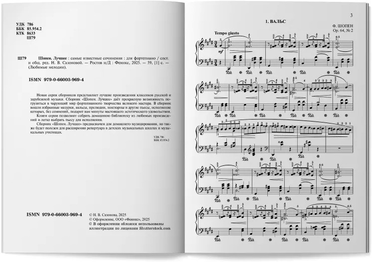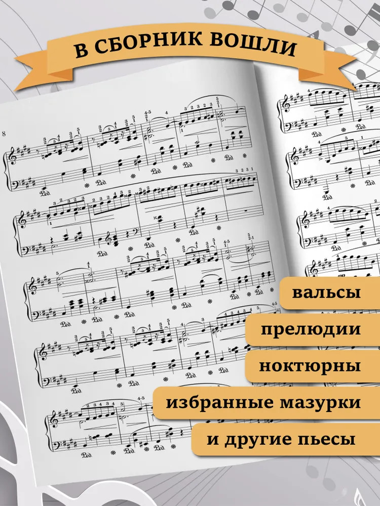 Серия: Любимые мелодии Новая серия сборников представляет лучшие произведения классиков русской и зарубежной музыки. Сборник «Шопен. Лучшее» даёт прекрасную возможность погрузиться в чарующий мир фортепианного творчества великого мастера. В сборник вошли избранные мазурки, вальсы, прелюдии, ноктюрны и другие пьесы, исполнение которых, без сомнений, подарит вам минуты настоящего эстетического удовольствия. Книги серии позволяют собрать домашнюю библиотеку из любимых произведений и легко выбрать пьесу для исполнения. Сборник «Шопен. Лучшее» предназначен для домашнего музицирования, но также будет полезен для расширения репертуара в детских музыкальных школах и музыкальных училищах. |