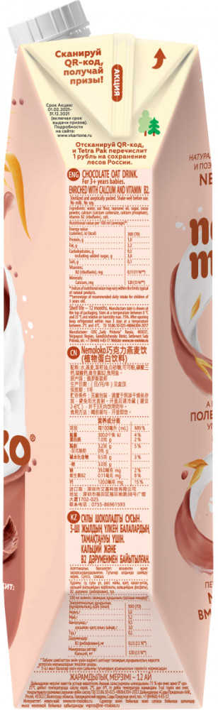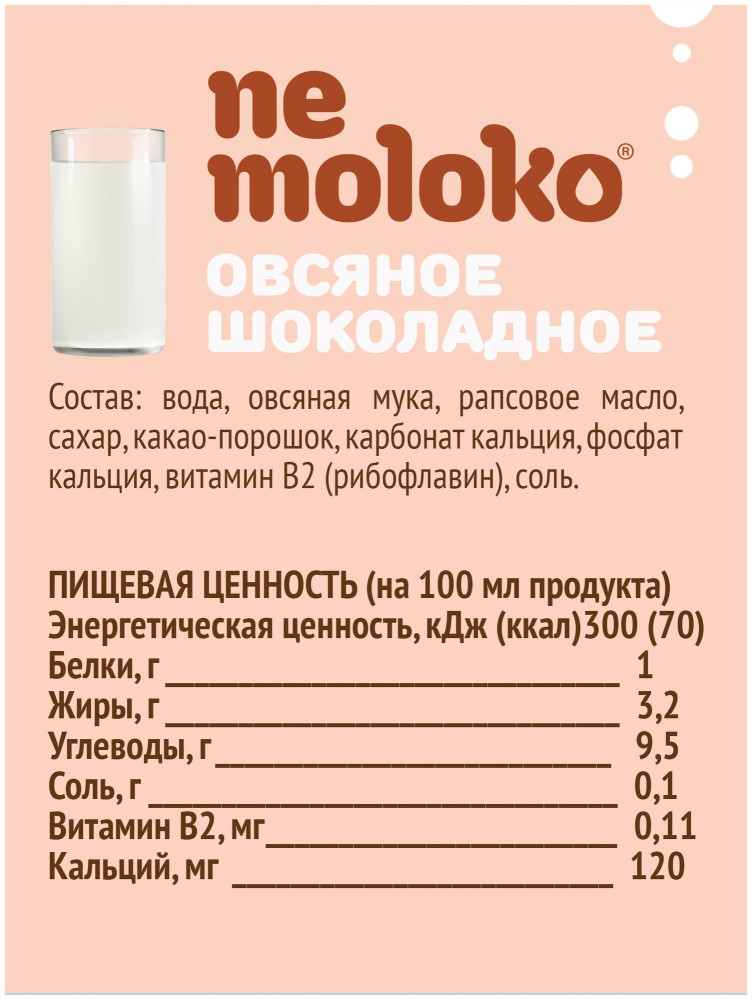 Когда хочется очень вкусного и полезного, на помощь приходит Nemoloko овсяное шоколадное. О пользе овса можно говорить часами — полезный, питательный, вкусный. Второй компонент — шоколад — не менее питательный продукт, обладающий тонизирующим и освежающим действием. Пейте с удовольствием на завтрак и в течение дня. Добавляйте в мюсли или просто пейте как горячий шоколад. Продукт обогащен кальцием и витамином В2.