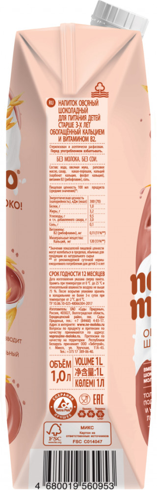 Nemoloko Напиток овсяный шоколадный обогащённый кальцием и витамином В2