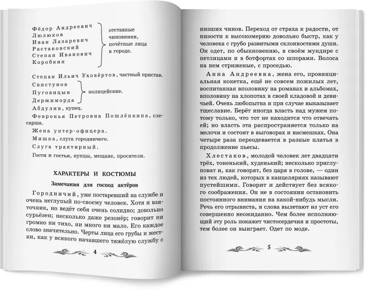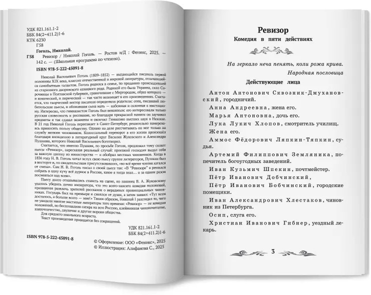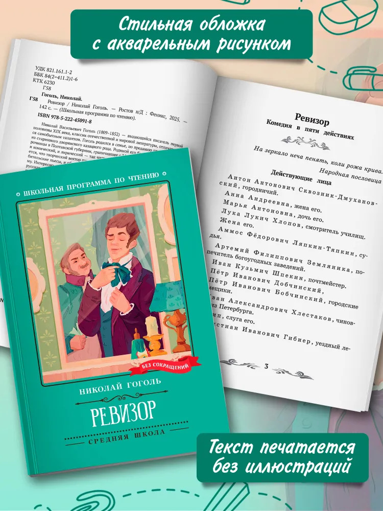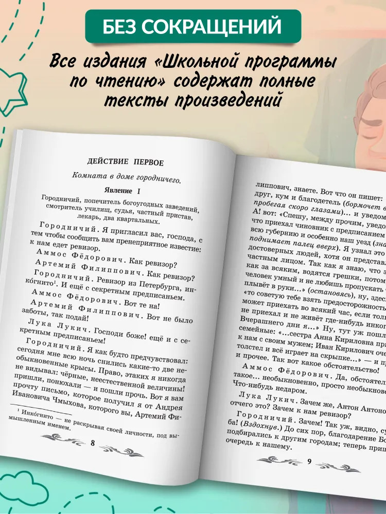 Серия: Школьная программа по чтению Николай Васильевич Гоголь (1809-1852) — выдающийся писатель первой половины XIX века, классик отечественной и мировой литературы, отличавшийся самобытным талантом. Сам Н. В. Гоголь писал о своей пьесе так: «В „Ревизоре“ я решился собрать в одну кучу всё дурное в России, какое я тогда знал... и за одним разом посмеяться над всем». Пьесу долго отказывались ставить на сцене, но наконец В. А. Жуковскому удалось убедить лично императора, что это всего-навсего комедия положений, призванная развлечь зрителей рассказом о нерадивых провинциальных чиновниках. Государь был на премьере и смеялся от души, а затем заявил: «Тут всем досталось, а больше всего — мне!» Таким образом, Николай I разглядел то, чего не увидели многие маститые литераторы того времени: «Ревизор» — не комедия положений, но беспощадная сатира на всю Россию, клеймившая чинопочитание, взяточничество, двуличие и другие пороки общества. |