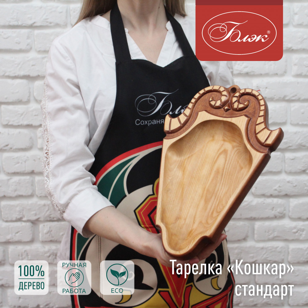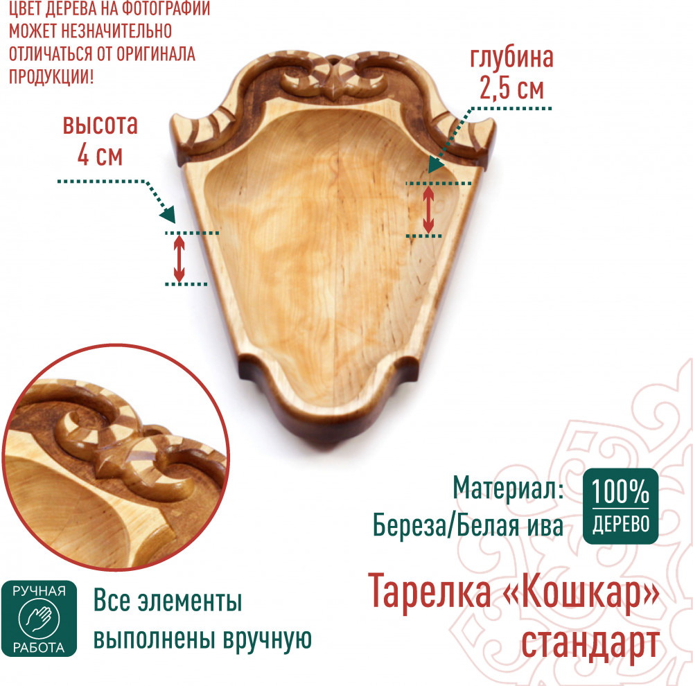 Тарелка «Кошкар» стандарт — дань традициям и мастерству. Изготовленная из натуральной берёзы (белой ивы), эта изящная тарелка выполнена в форме головы барана — символа изобилия, силы и благополучия. Мягкие линии и плавные изгибы рогов придают изделию особую выразительность и гармонию.