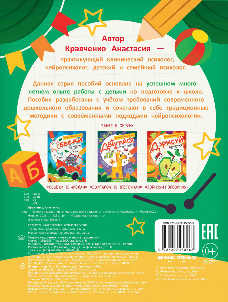 Серия: Графические диктанты Данная серия пособий основана на успешном многолетнем опыте работы с детьми по подготовке к школе. Пособия разработаны с учётом требований современного дошкольного образования и сочетают в себе традиционные методики с современными подходами нейропсихологии. |