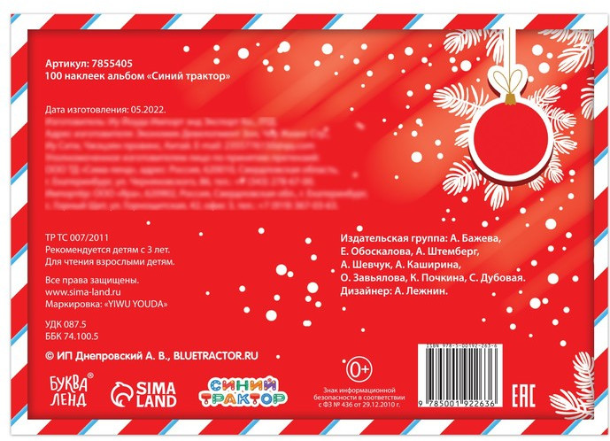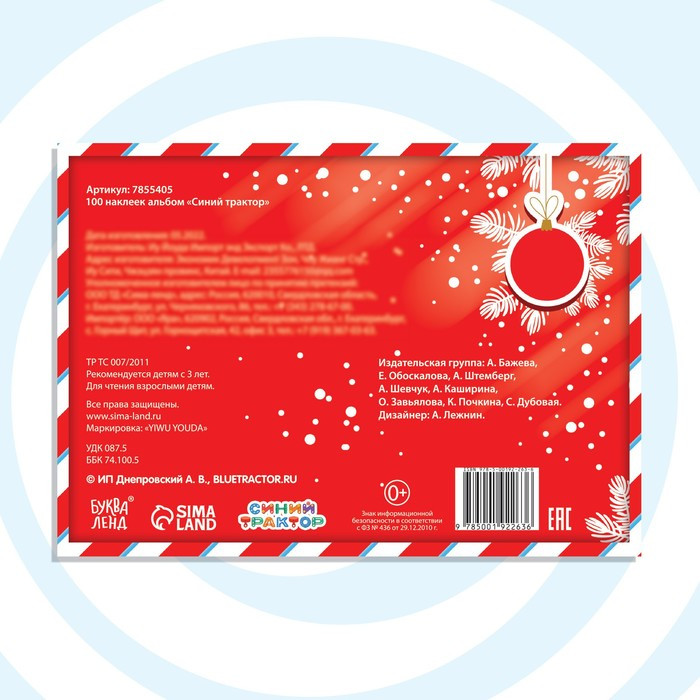 Синий трактор Набор наклеек с заданиями в альбоме «Новогодние приключения»новинка В данный момент этот товар отсутствует в продаже. Возможно, у нас найдется аналогичный или похожий товар здесь. С набором ярких наклеек встречать праздники ребёнку будет вдвойне весело. Ведь малыш подружится с весёлыми героями любимого мультфильма! В альбоме представлено 100 тематических наклеек с красочными изображениями Синего трактора и других героев полюбившегося мультфильма. Яркие картинки положительно влияют на визуальное восприятие, память и воображение малыша. На каждой странице есть развивающие задания, который ребёнок с интересом выполнит. Рекомендовано для детей от 3 лет. |