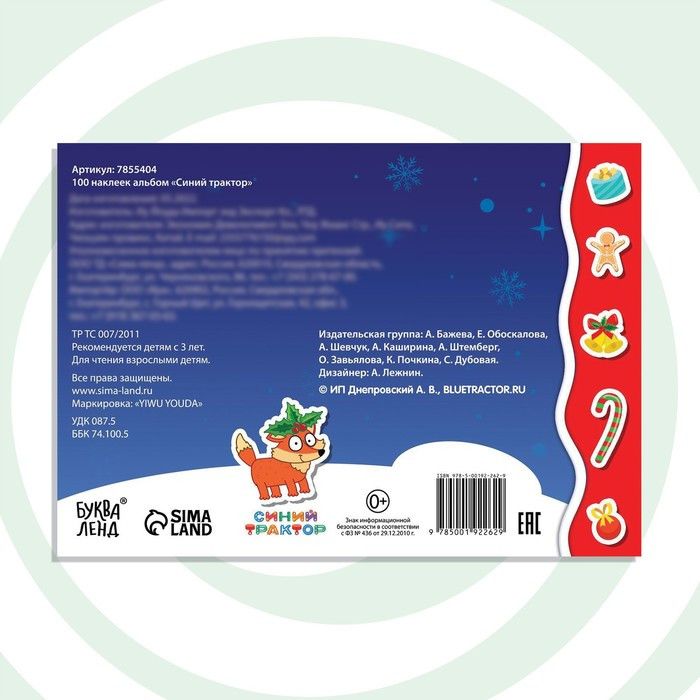 Синий трактор Набор наклеек с заданиями в альбоме «Новый год»новинка В данный момент этот товар отсутствует в продаже. Возможно, у нас найдется аналогичный или похожий товар здесь. С набором ярких наклеек встречать праздники ребёнку будет вдвойне весело. Ведь малыш подружится с весёлыми героями любимого мультфильма! В альбоме представлено 100 тематических наклеек с красочными изображениями Синего трактора и других героев полюбившегося мультфильма. Яркие картинки положительно влияют на визуальное восприятие, память и воображение малыша. На каждой странице есть развивающие задания, который ребёнок с интересом выполнит. Рекомендовано для детей от 3 лет. |