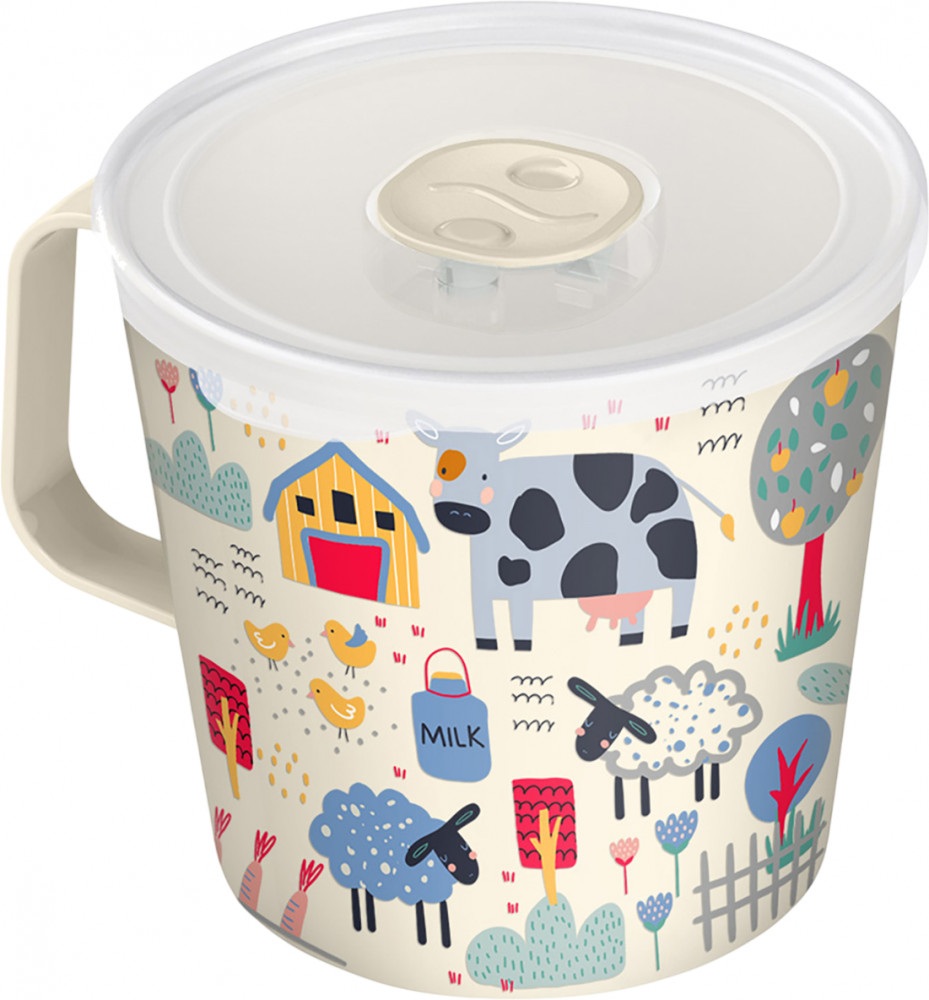 Контейнер-кружка подойдёт для хранения и разогрева блюд в микроволновой печи дома и в офисе, а также для использования в дороге. Благодаря клапану блюдо можно разогревать с закрытой крышкой, защищая микроволновку от брызг. Плотно надевающаяся крышка сохранит тепло уже согретого блюда и не даст ему расплескаться. IML-декор наносится на весь корпус и вплавляется в изделие на этапе литья, поэтому он не стирается и долго радует глаз. Для производства используется безопасный полипропилен, который не содержит бисфенола А.