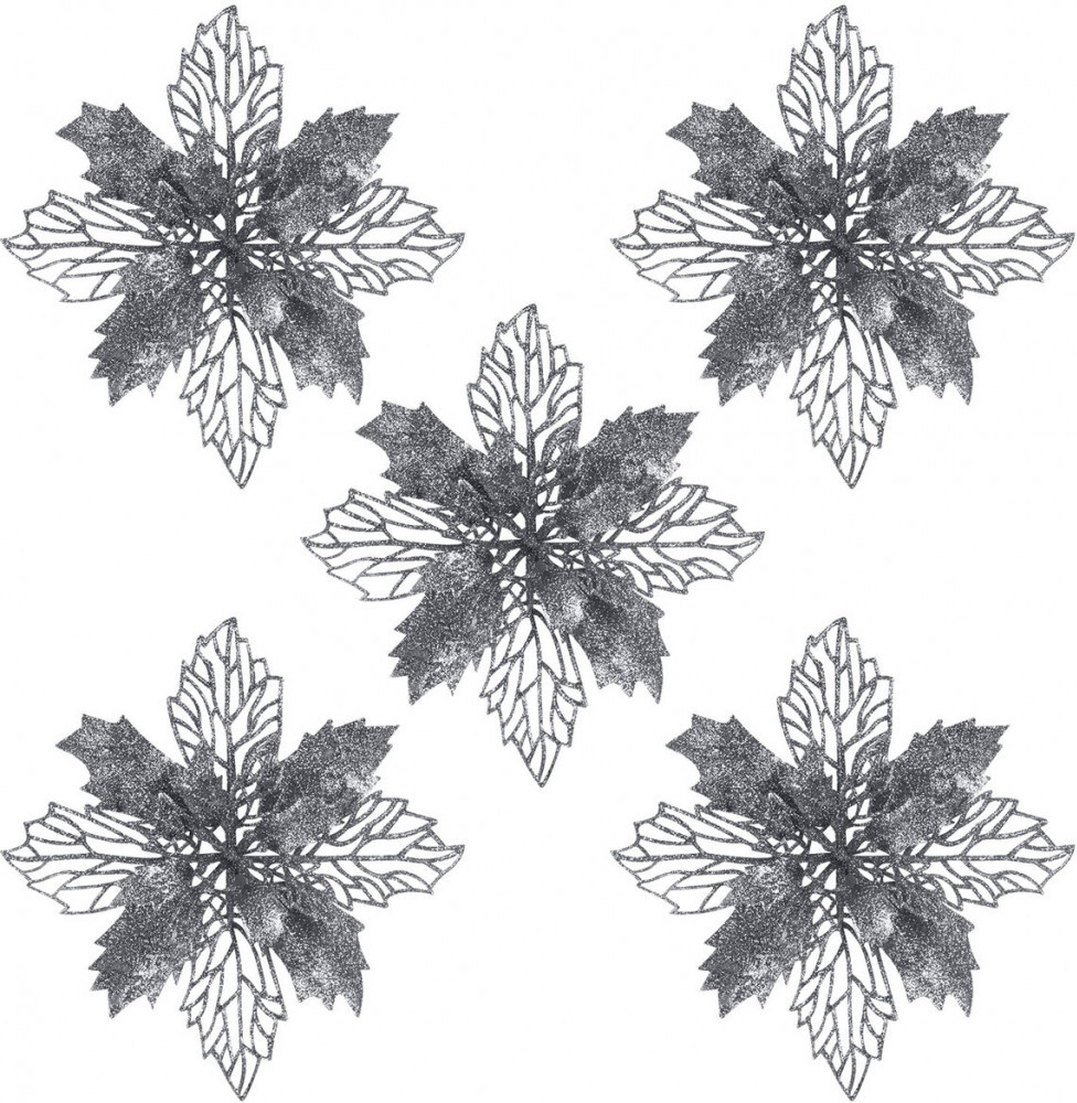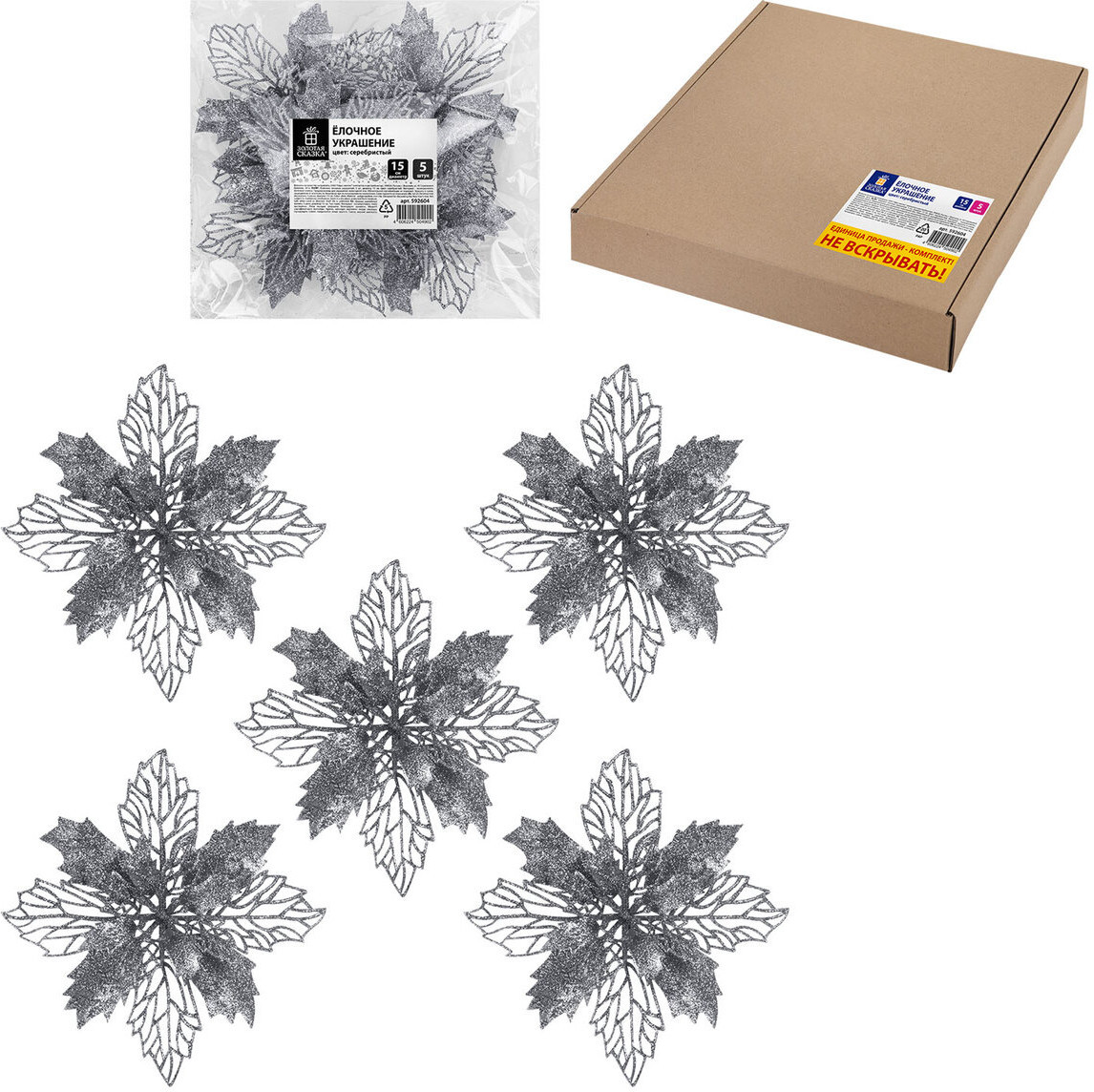 В комплекте 5 цветков. Поставляются в 1 цвете: серебристый. Диаметр украшения — 15 см. Материал — ПВХ. Упакованы в картонную коробку.