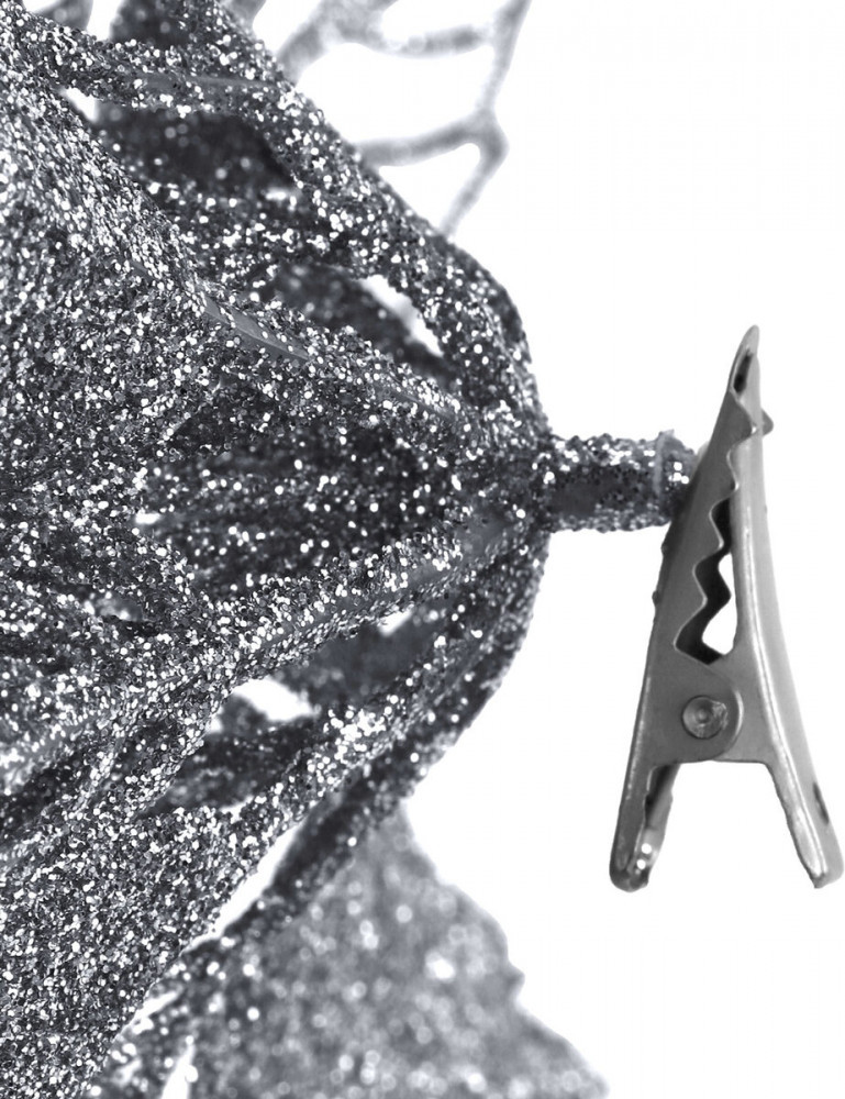 Серебристые цветы создают элегантную и гармоничную композицию, которая будет великолепно смотреться на вашей елке. Разместите их по всей высоте ели, чтобы создать праздничный ансамбль, который будет радовать вас и ваших гостей на протяжении всего зимнего сезона. Цветы легко и надежно фиксируются на ветвях, не соскальзывая и не теряясь. Они добавят дому или офису нотку роскоши и изысканности.