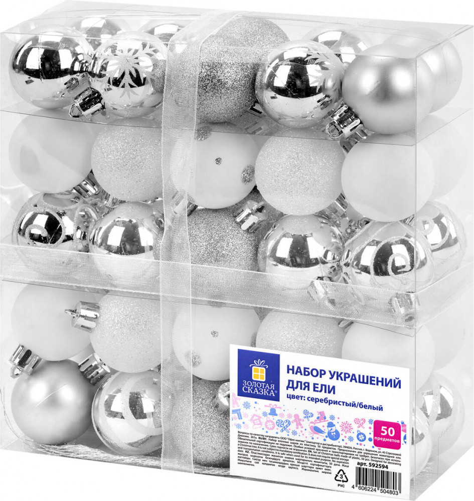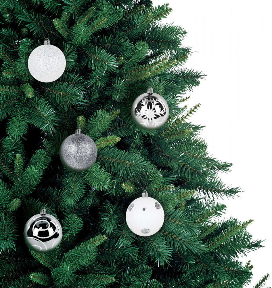 • 16 шаров серебристого цвета с глянцевым эффектом и рисунком (диаметром 4 см).