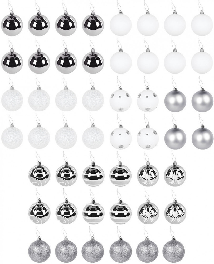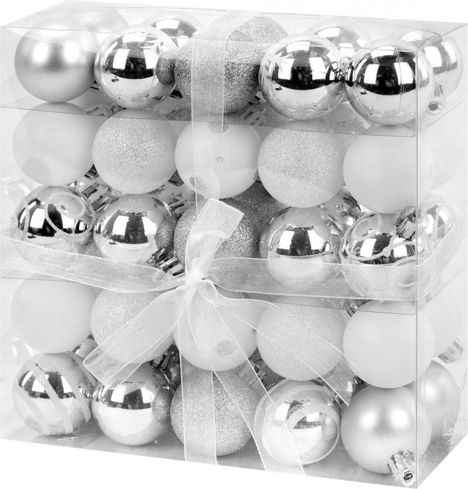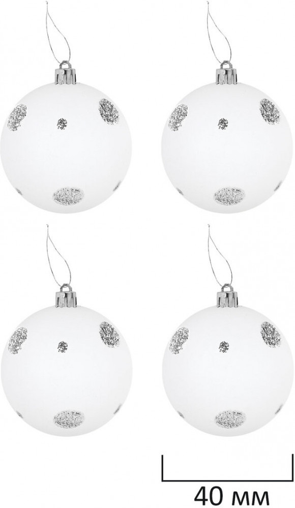 • 4 шара белого цвета с матовым эффектом и серебристым рисунком (диаметром 4 см);