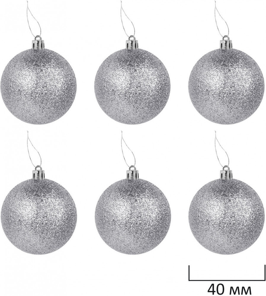 • 6 шаров серебристого цвета с эффектом глиттер (диаметром 4 см);