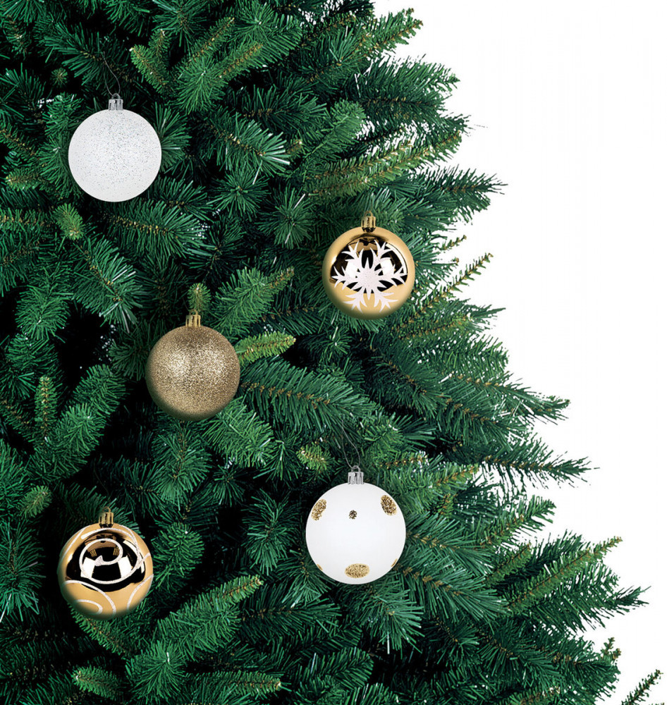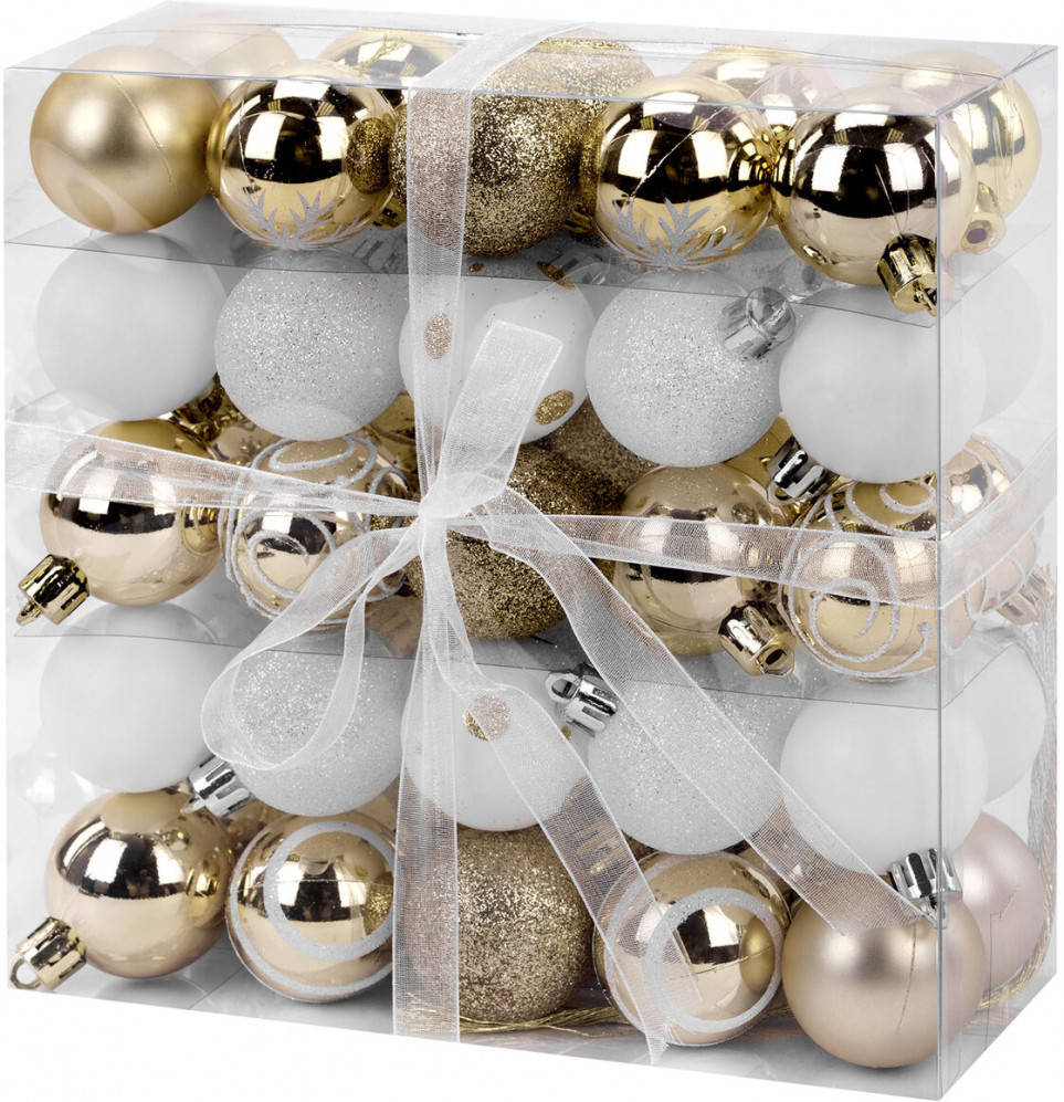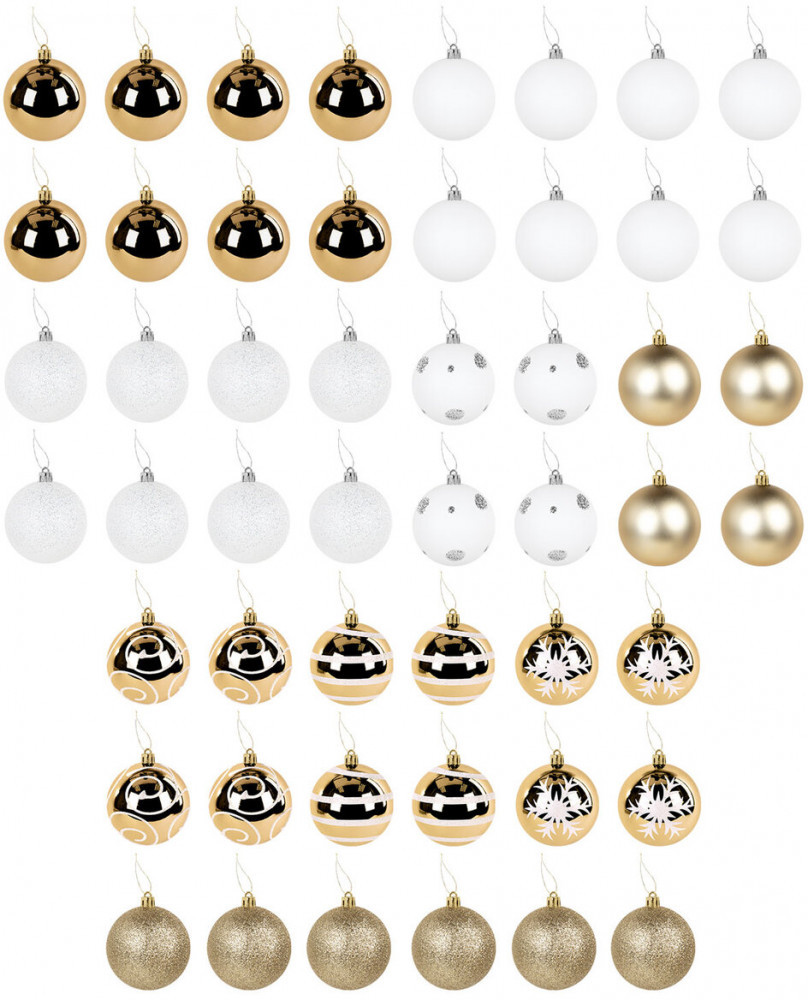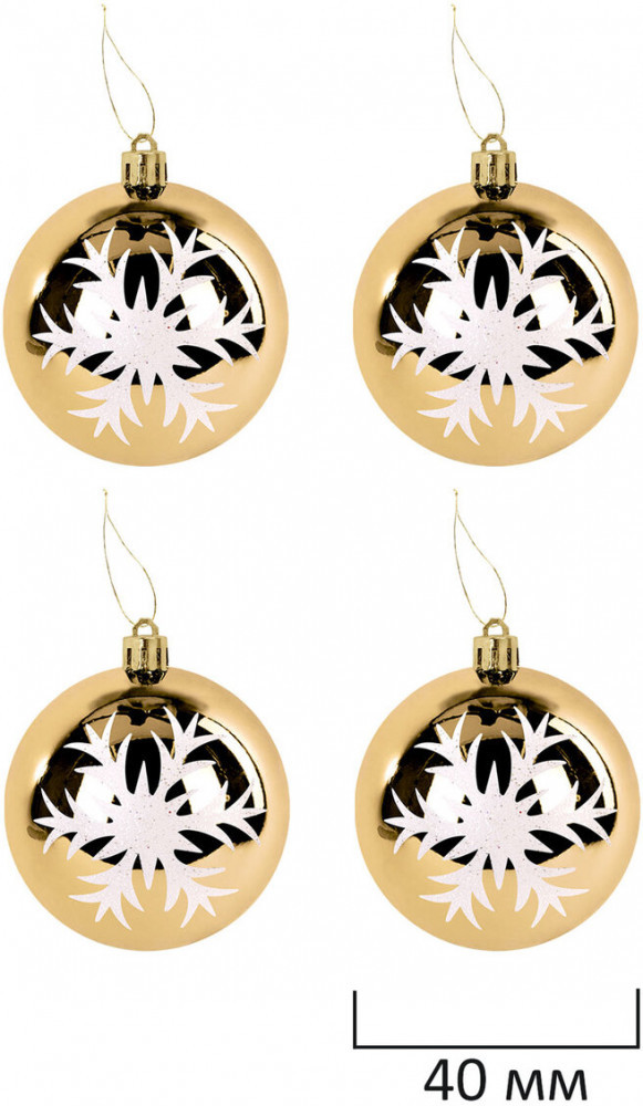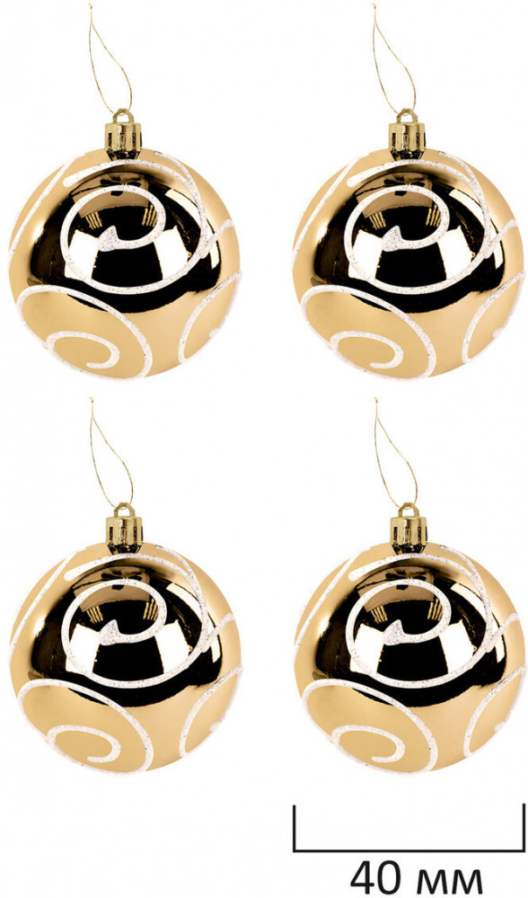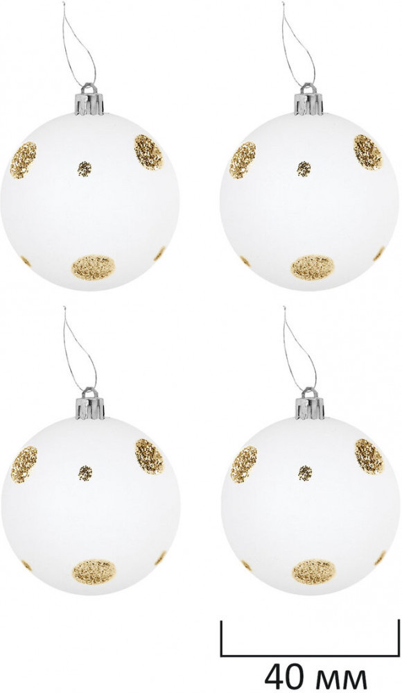 • 4 шара белого цвета с золотистым рисунком и матовым эффектом (диаметром 4 см);