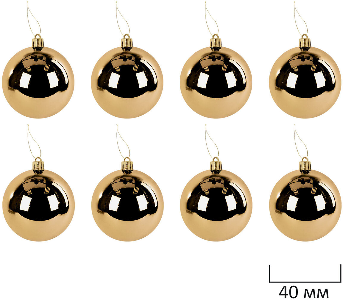 • 8 шаров золотистого цвета с глянцевым эффектом (диаметром 4 см);
