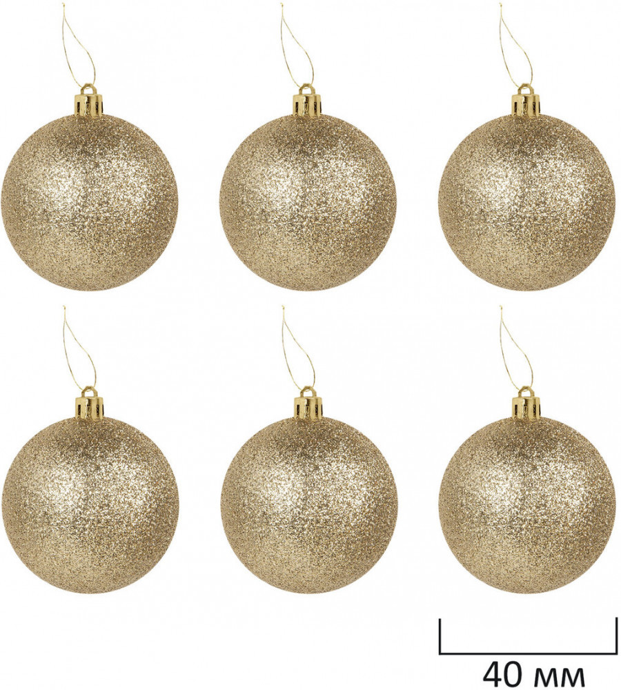• 6 шаров золотистого цвета с эффектом глиттер (диаметром 4 см);