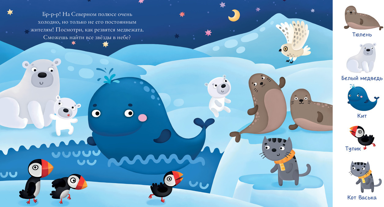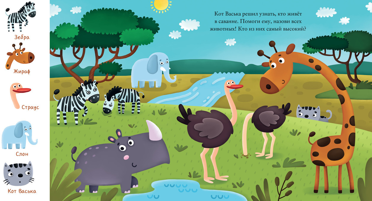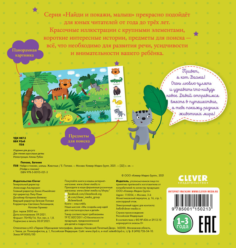 Серия: Найди и покажи, малыш Серия «Найди и покажи», малыш прекрасно подойдет для юных читателей от года до трех лет. Красочные иллюстрации с крупными элементами, короткие интересные истории, предметы для поиска — все, что необходимо для развития речи, усидчивости и внимательности вашего ребенка. Привет, я кот Васька! Очень люблю гулять и узнавать что-нибудь новое. Давай отправимся вместе в путешествие, я тебе покажу разных животных мира! |
