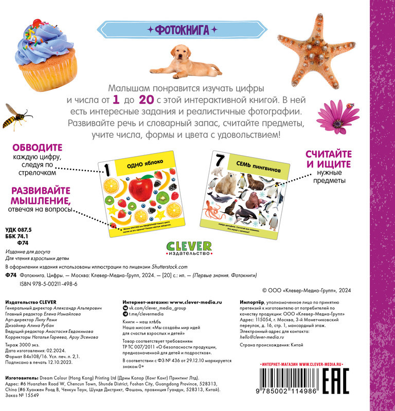 Серия: Первые знания. Фотокниги Фотокнига «Цифры» увлечет ребенка надолго и научит считать от 1 до 20. Почему работать с этой книжкой так интересно? На каждом развороте малыш будет знакомиться с новым числом, обводить пальчиком контуры крупных цифр по стрелкам, играть в «найди и покажи», отыскивая и считая заданные предметы, отвечать на вопросы по картинке. Кроме того, ребенок повторит формы и цвета. Благодаря большому формату издание вмещает на своих страницах множество предметов и займет ребенка надолго. А яркие фотографии и плотный картон позволят с успехом заниматься по книге даже с самыми маленькими читателями. |