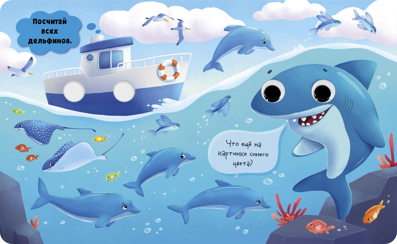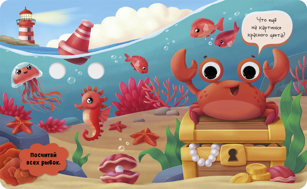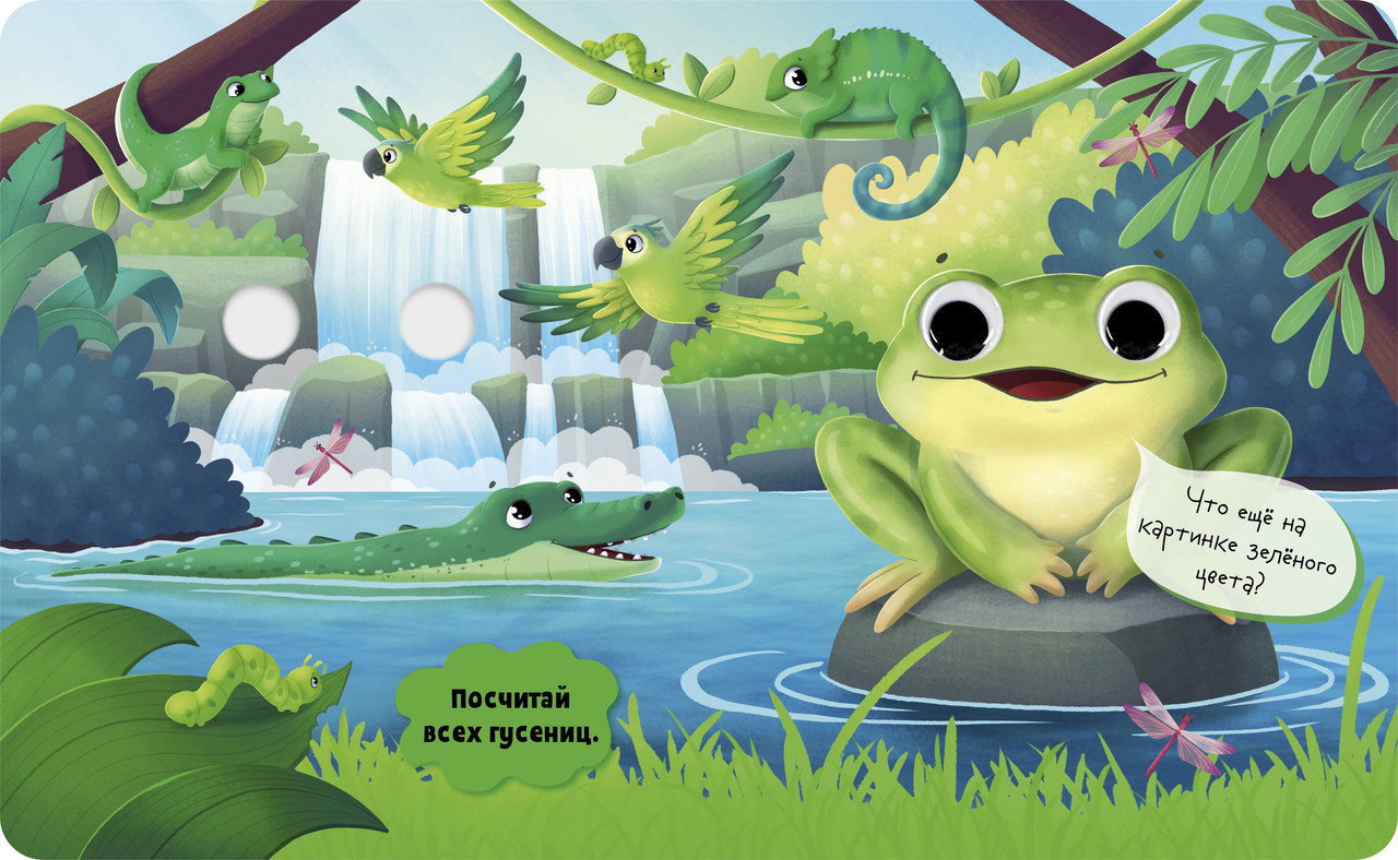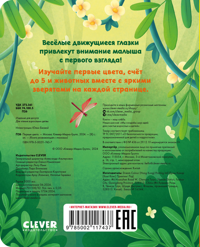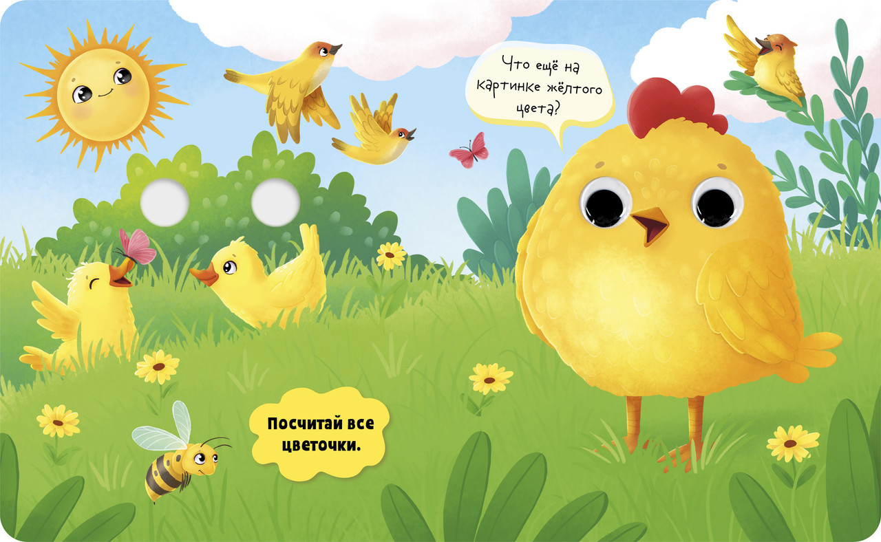 Серия: Книга развивающая с глазками Книжка из прочного картона «Первые цвета» поможет поиграть с малышом, ведь у каждого героя здесь есть веселые движущиеся глазки. Яркие картинки с милыми иллюстрациями познакомят с основными цветами — красным, желтым, зеленым, синим... Желтые цветочки, синие дельфины, зеленые гусеницы, желтый цыпленок! А еще развивашка поможет ребенку научиться считать до 5. Ему нужно сосчитать на картинке гусениц, цветочки, дельфинов, рыбок. Листая плотные картонные странички и отвечая на вопросы, малыш будет развивать речь, внимание, память. |