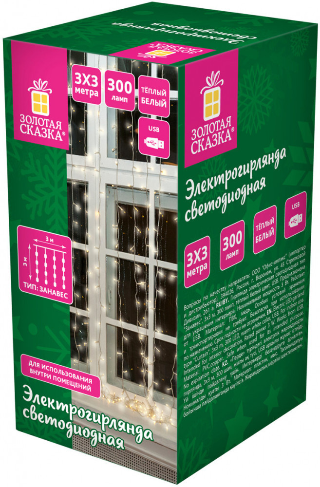 Электрогирлянда типа «Штора» — один из самых популярных видов гирлянд сегодня. Мягкий, но насыщенный свет этих украшений помогает создать уютное свечение в помещении. Гирлянда электрическая светодиодная представляет собой светодиоды, соединенные между собой электрическим проводом. Тип конструкции электрогирлянды — «Штора». Данный тип конструкции предусматривает наличие основного провода рабочей части электрогирлянды без светодиодов, к которому перпендикулярно присоединены 10 нитей длиной 3 м, на каждой из которых по 30 светодиодов. Длина основного провода рабочей части гирлянды составляет 3 м, длина кабеля питания — 3 м. Количество светодиодных ламп — 300 шт. Лампы сделаны на основе технологии LED, которая является более безопасной и эффективной по сравнению с лампой накаливания.